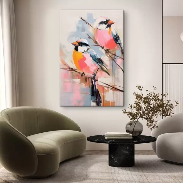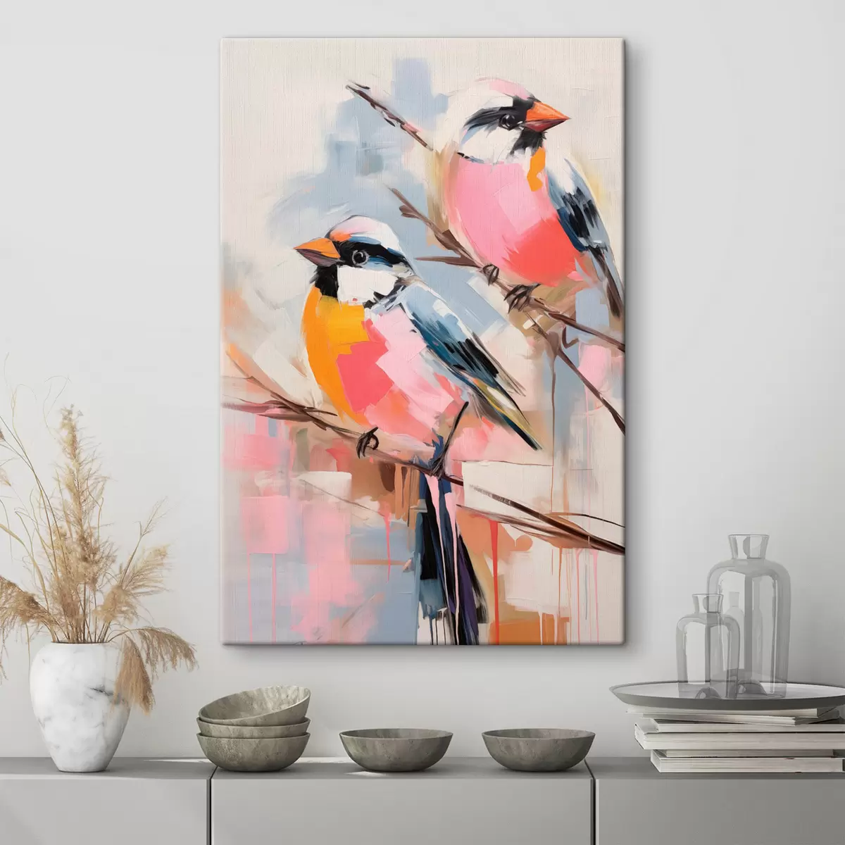 Glezna Krāsaini putni, kas sēž uz zara uz maiga pasteļkrāsas fona Nr s45578