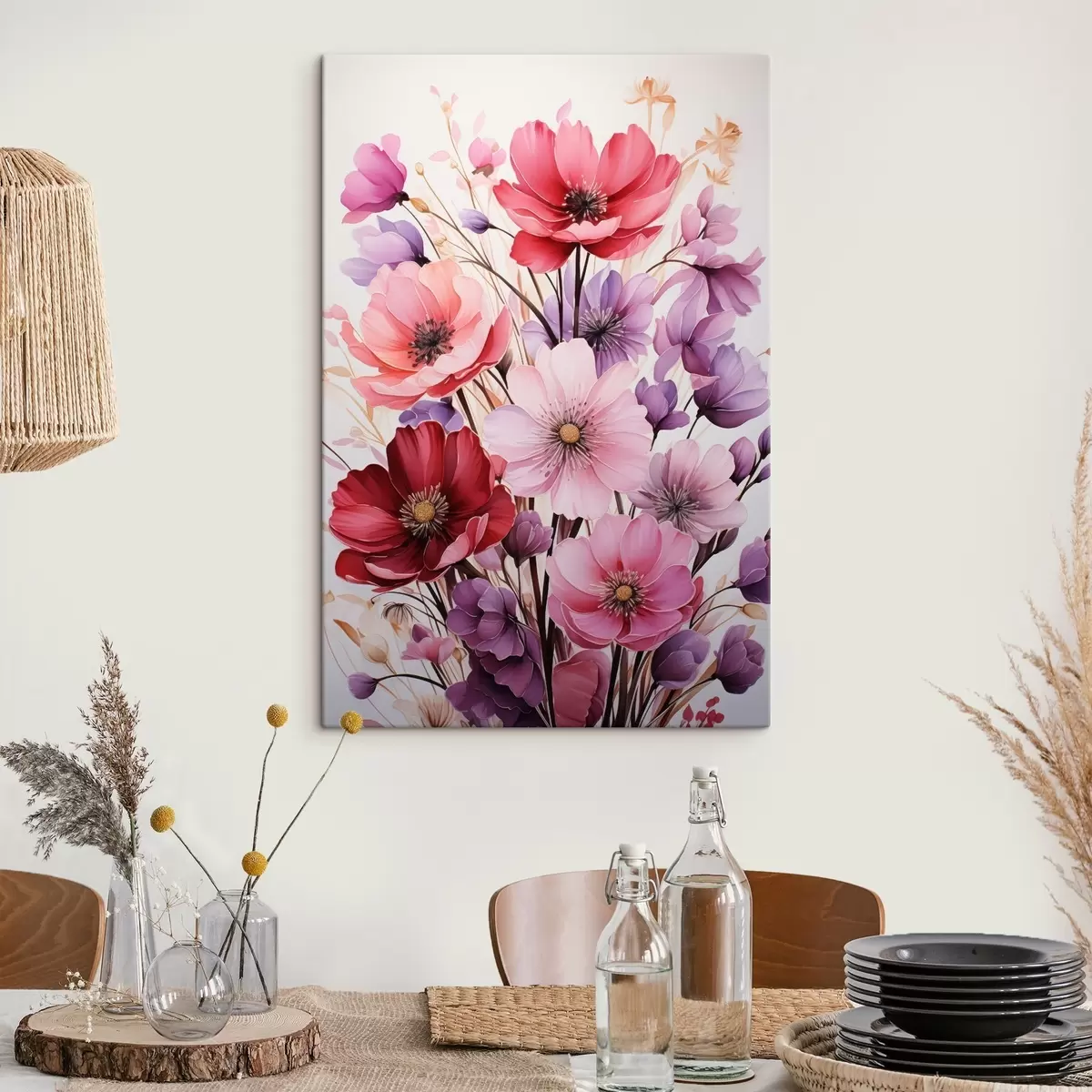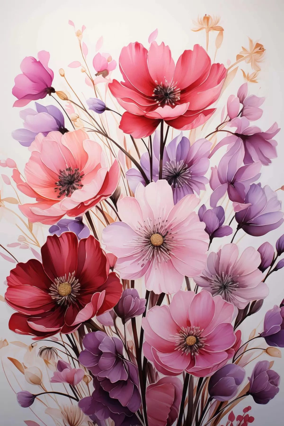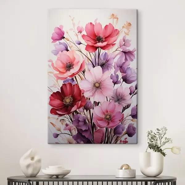 Glezna Delikāts rozā un ceriņu magoņu pušķis uz gaiša fona, akvareļu stilā Nr s45601