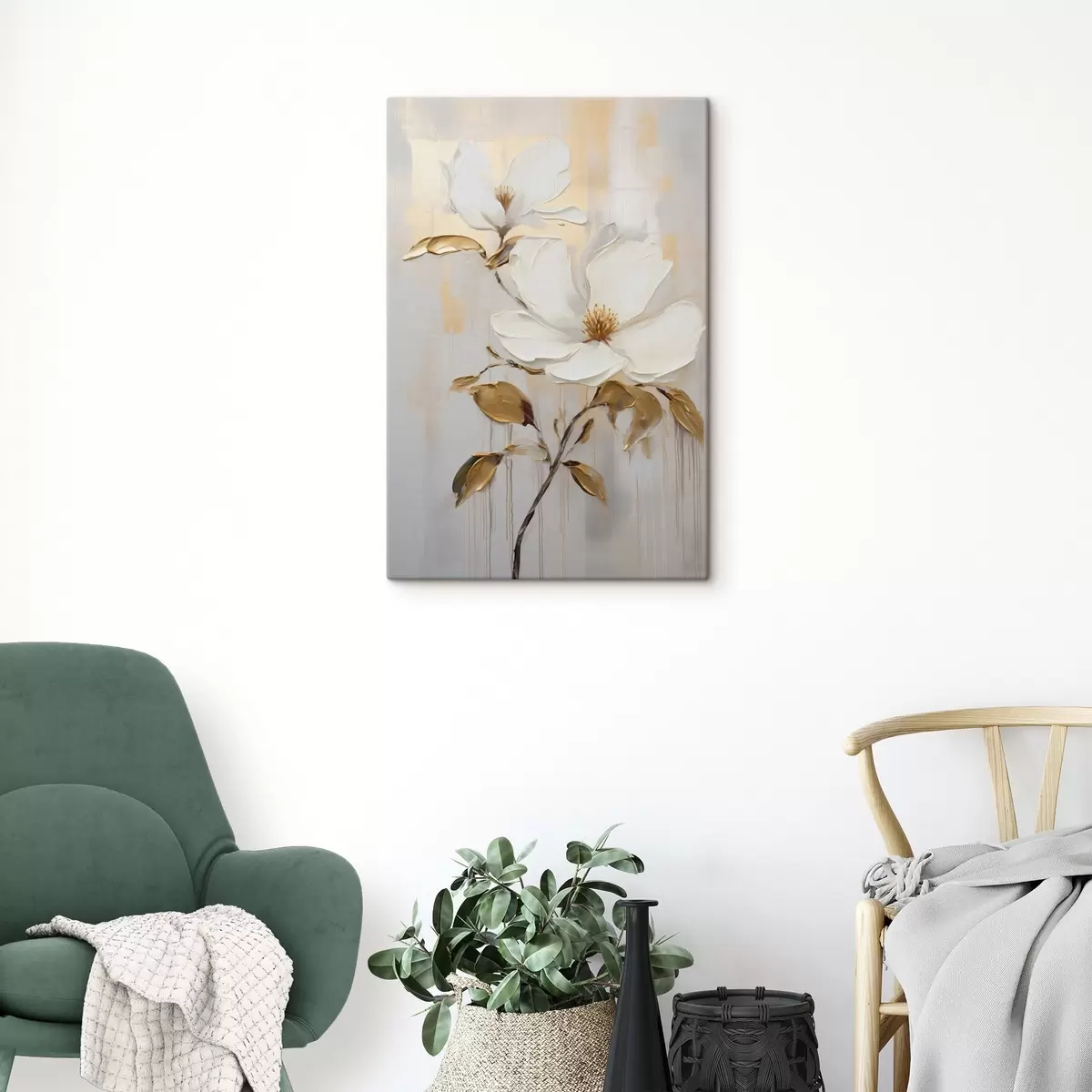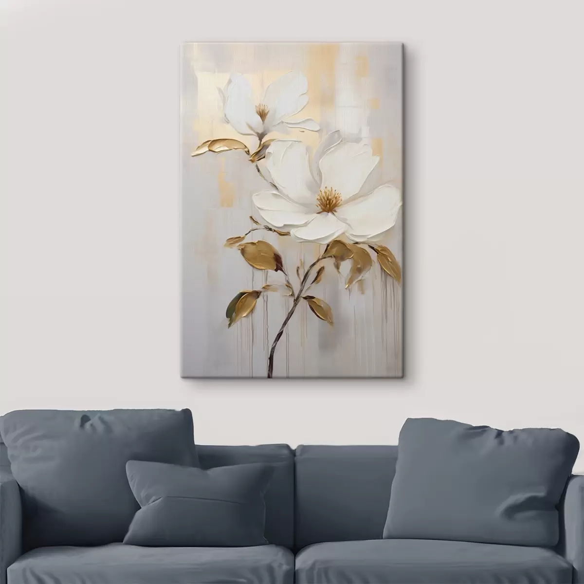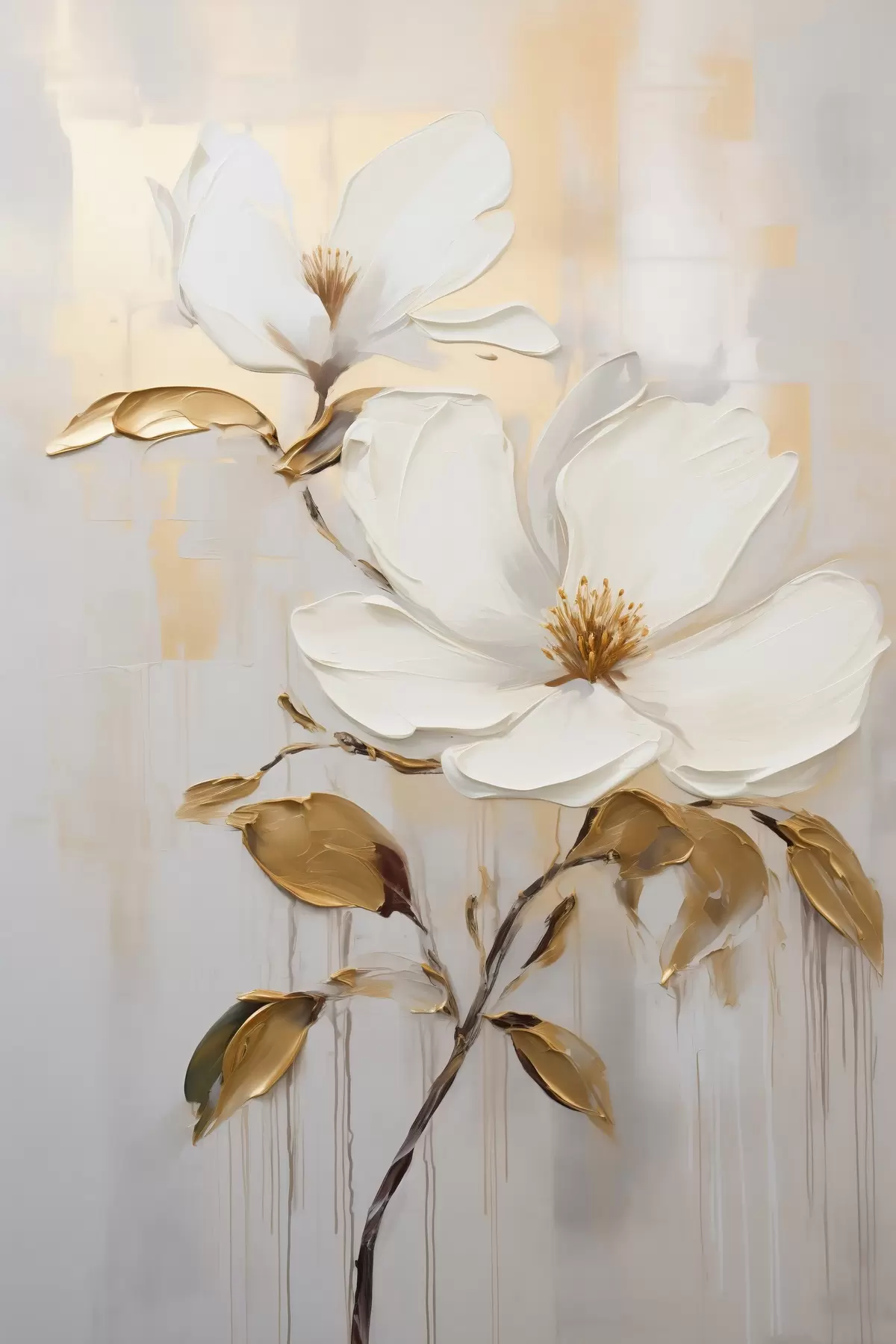 Glezna Divi balti ziedi ar dzeltenīgi oranžām lapām uz gaiša fona Nr s45691