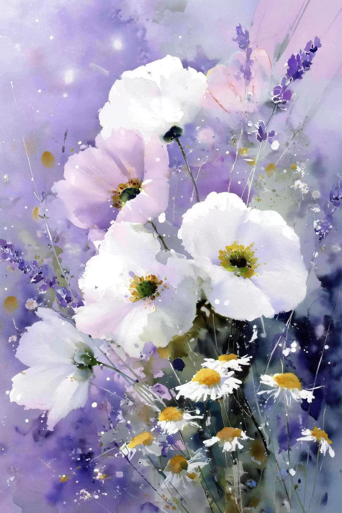 Glezna akvareļu pušķis violetos un baltos toņos Nr s45719