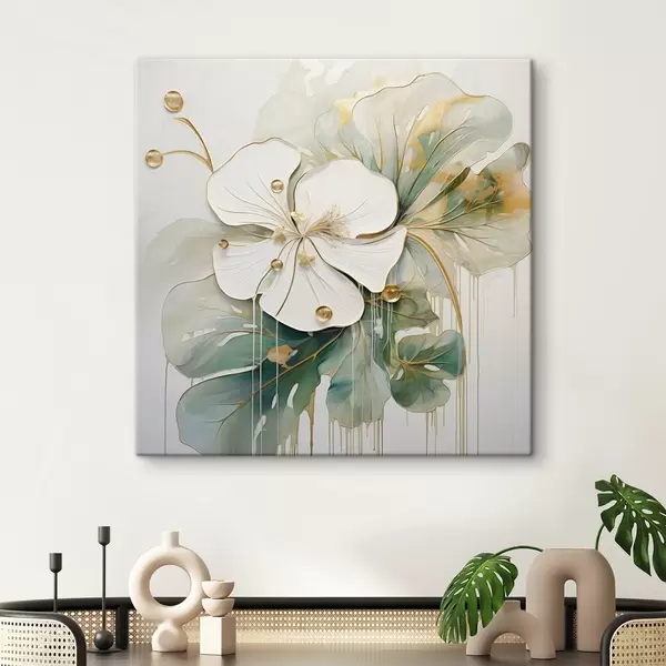 Glezna Balts zieds ar dzeltenoranžiem akcentiem un zaļām lapām Nr s45815