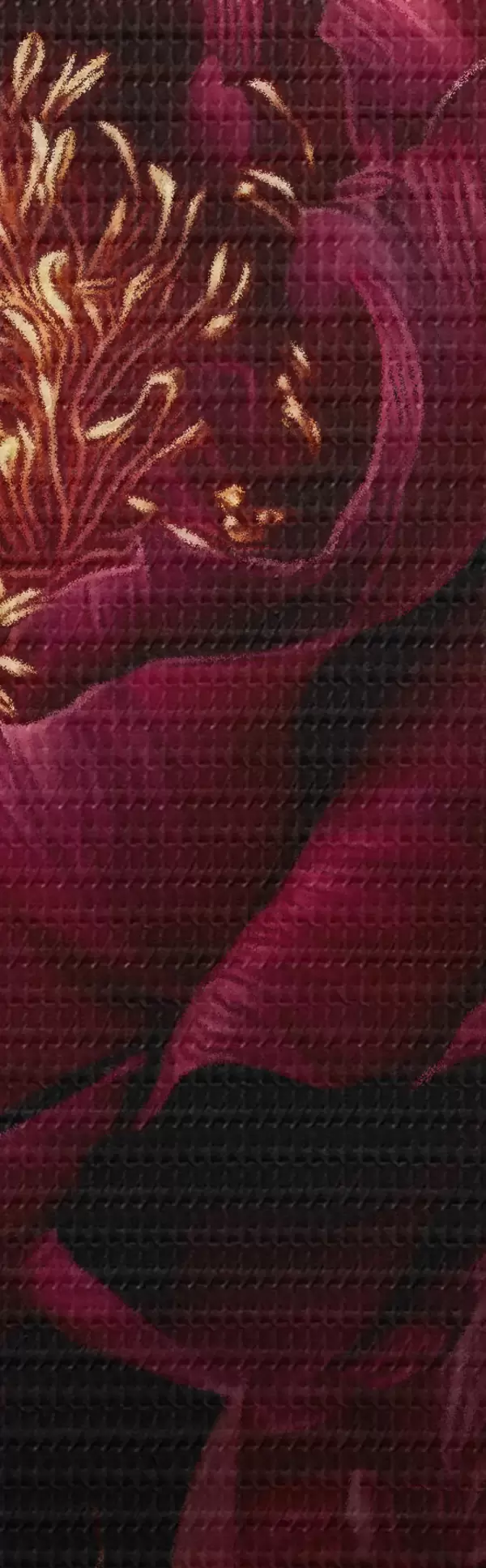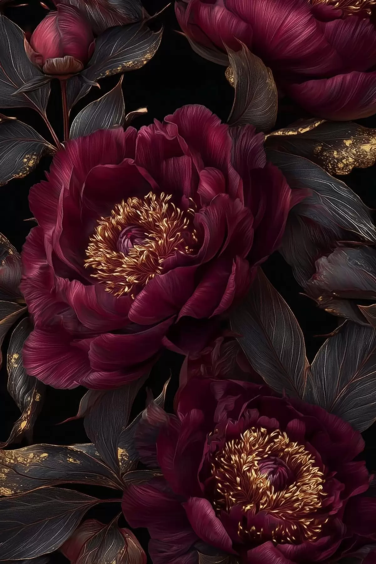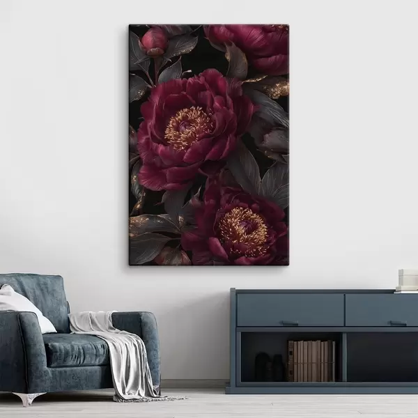 Glezna Burgundijas peonijas uz melna fona ar dzelteniem akcentiem s45877