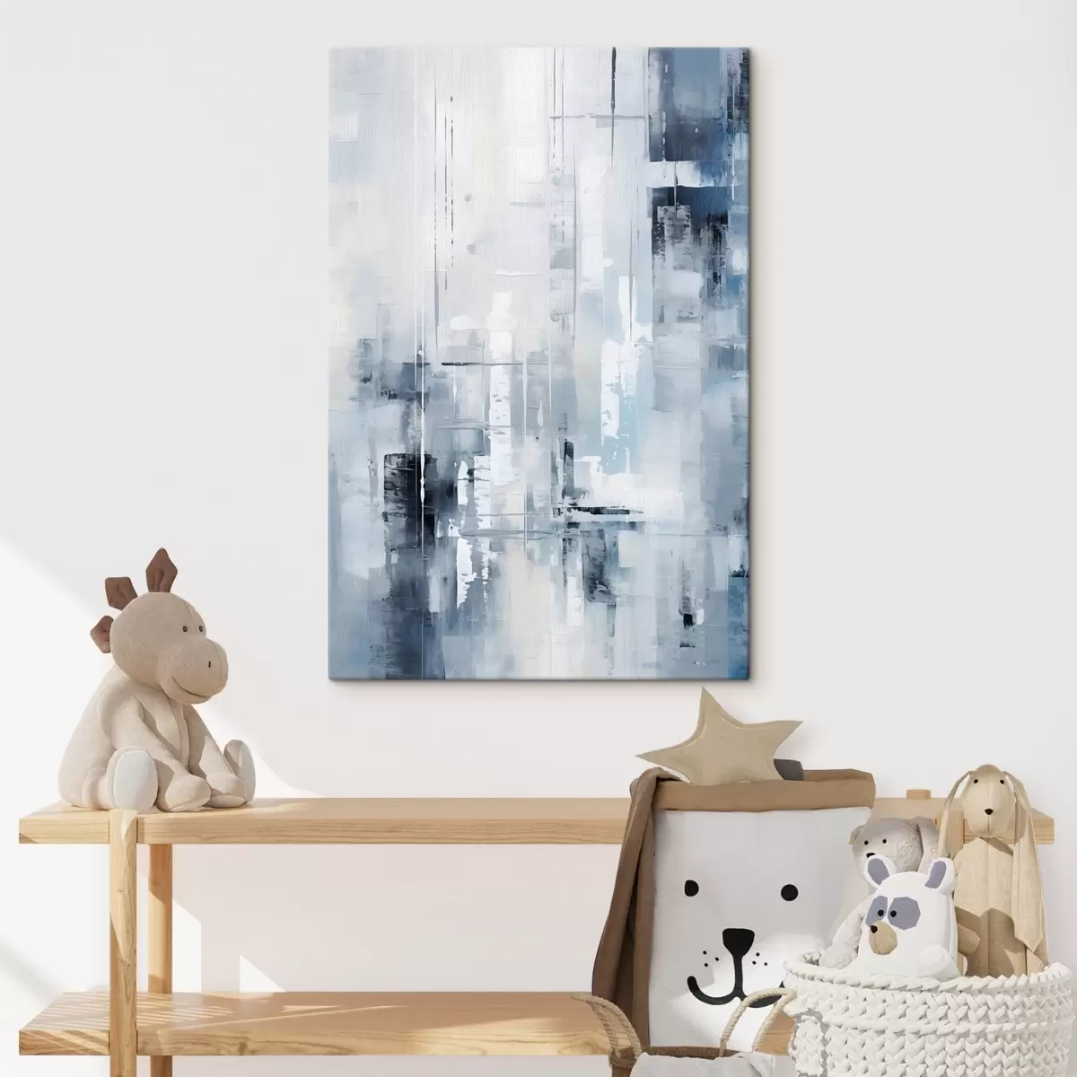 Glezna Abstrakta glezna, kurā izmantotas zilas, pelēkas un baltas krāsas, vertikālas līnijas un ģeometriskas formas s45927