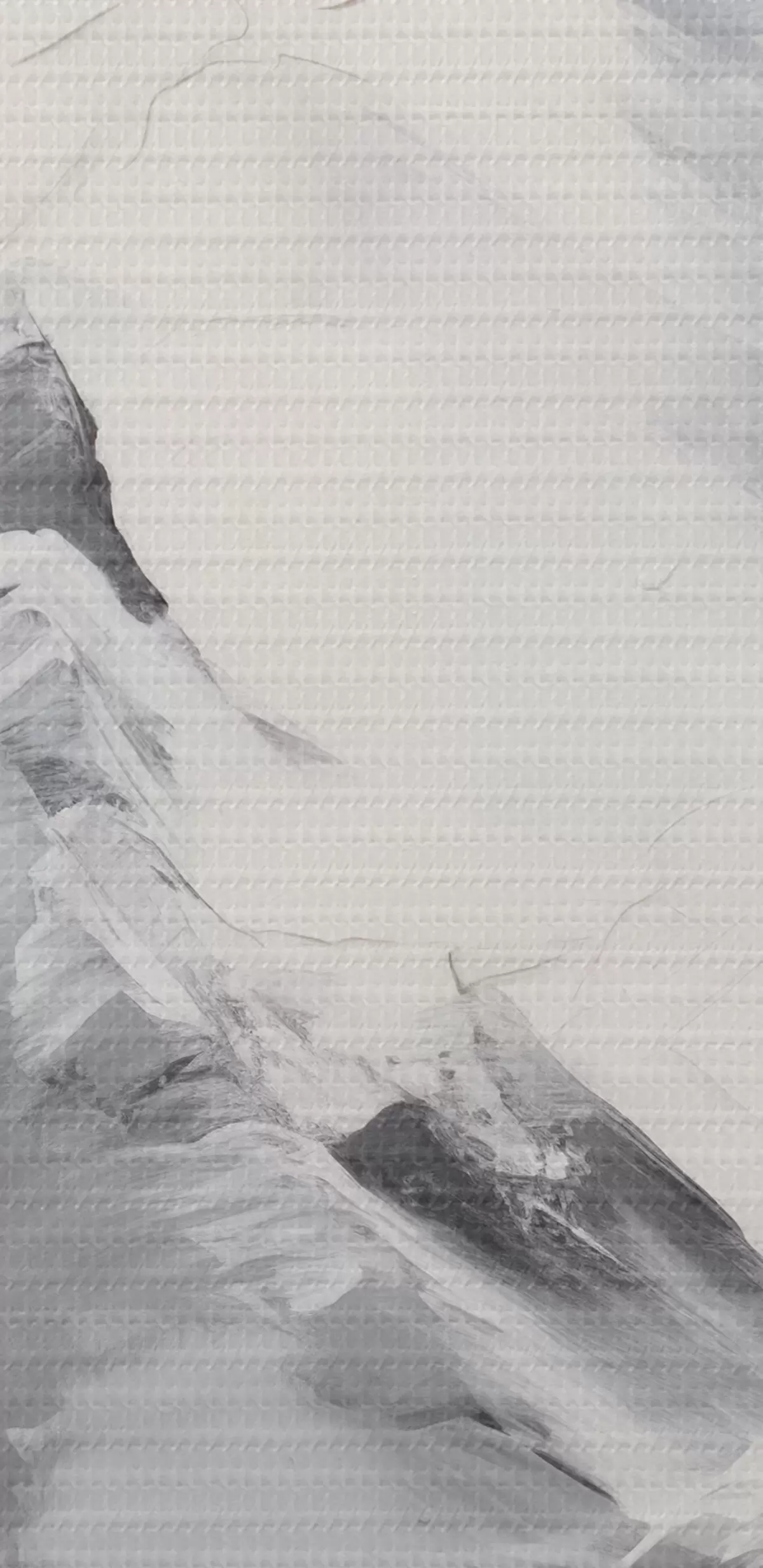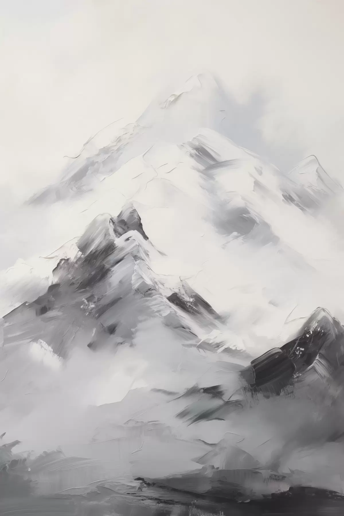Glezna Sniegotas kalnu virsotnes ar pelēkiem ēnām, pelēks debesis, otas triepieni, teksturēts, minimālisma stils s45933