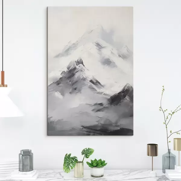 Glezna Sniegotas kalnu virsotnes ar pelēkiem ēnām, pelēks debesis, otas triepieni, teksturēts, minimālisma stils s45933