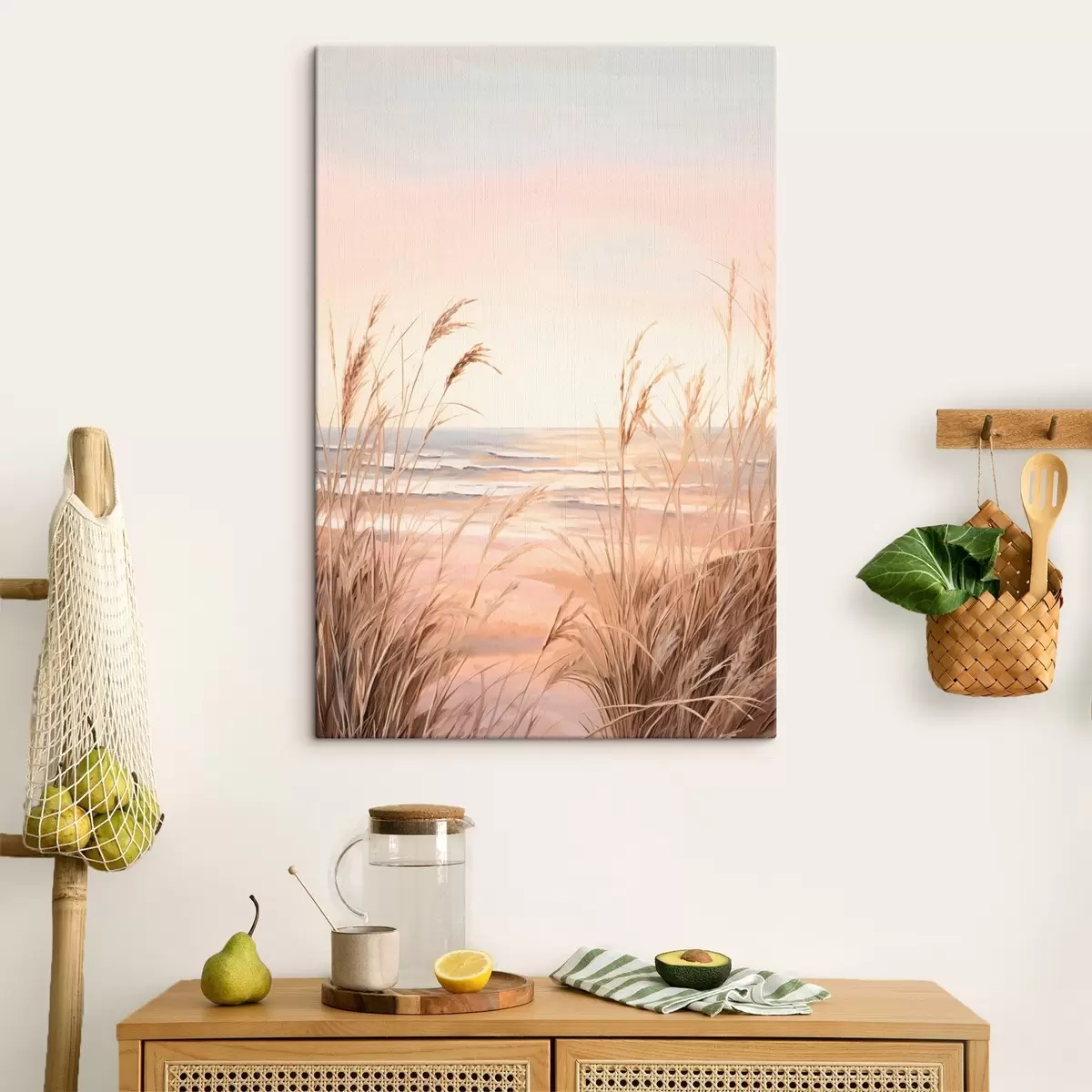 Glezna Pampas zāle ar pasteļoranžu krāsu paleti, gaiši rozā debesis, mierīgs ainava Nr s45935