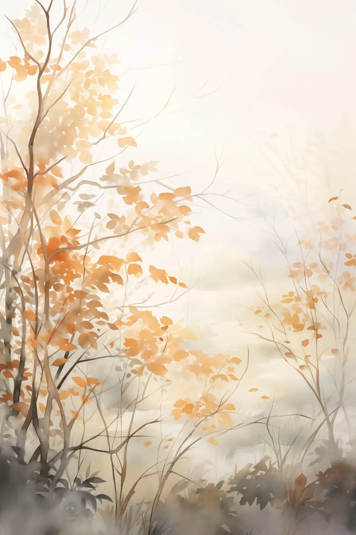 Glezna Rudens koki ar oranžām lapām un zariem, maigs akvareļu stils, delikāti otas triepieni Nr s45941