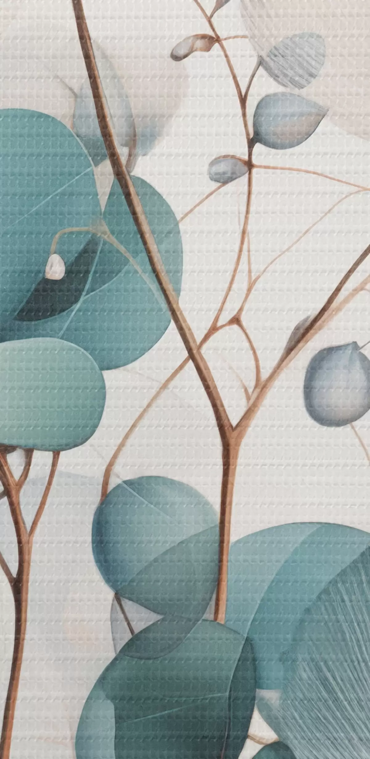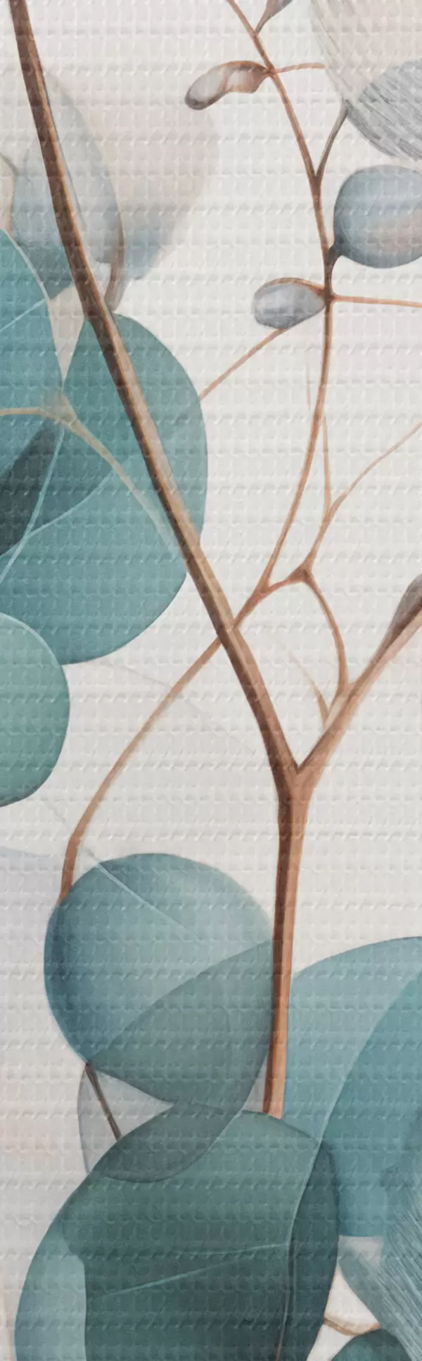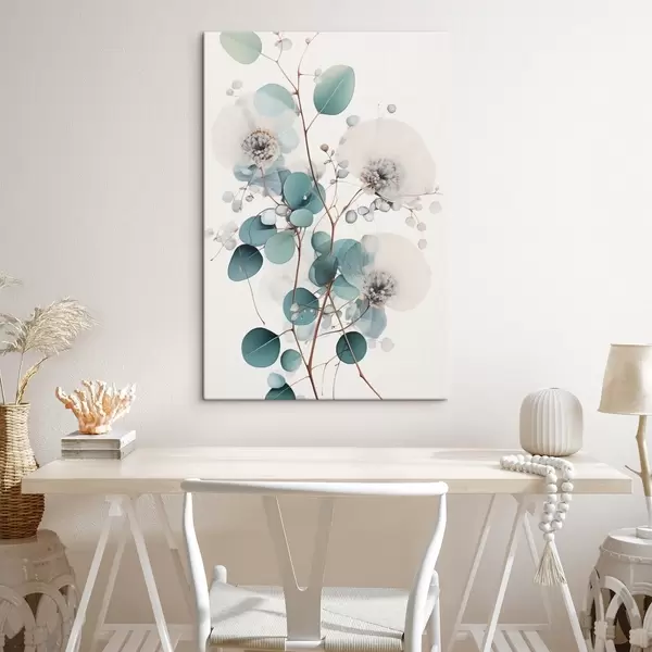 Glezna Eikalipta abstraktas ziedi ar baltiem ziedlapiem, klusināti zaļas lapas uz zariem s45946