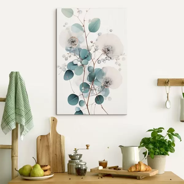Glezna Eikalipta abstraktas ziedi ar baltiem ziedlapiem, klusināti zaļas lapas uz zariem Nr s45946