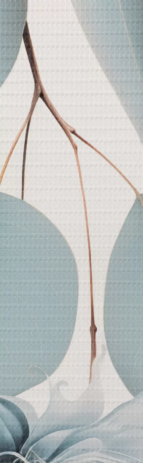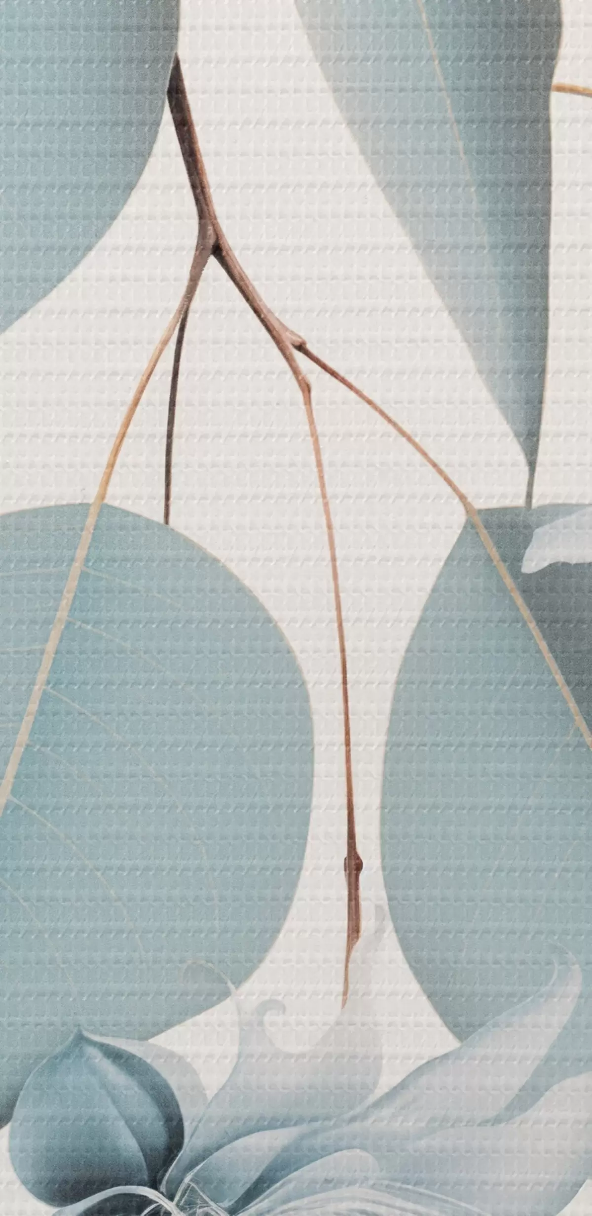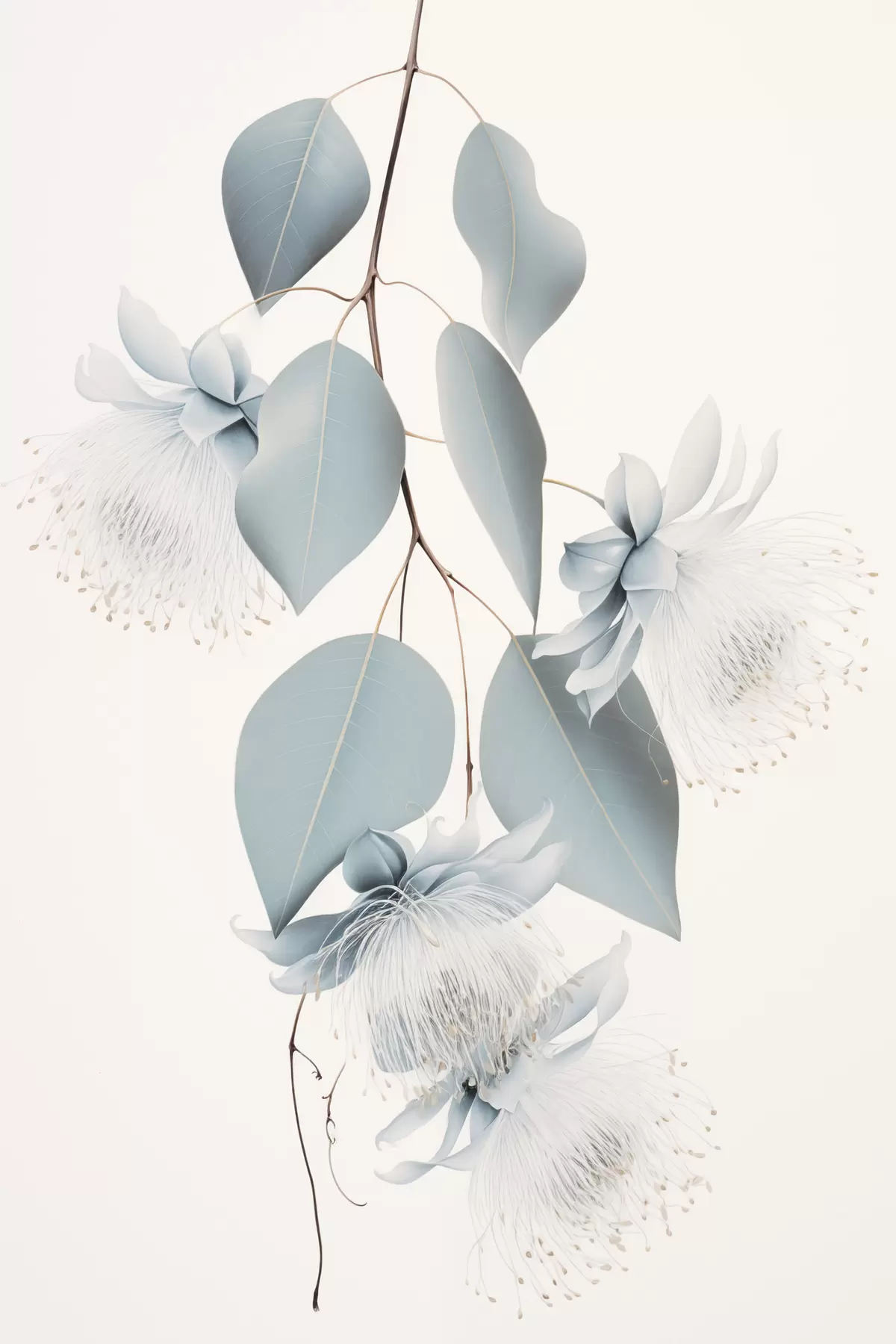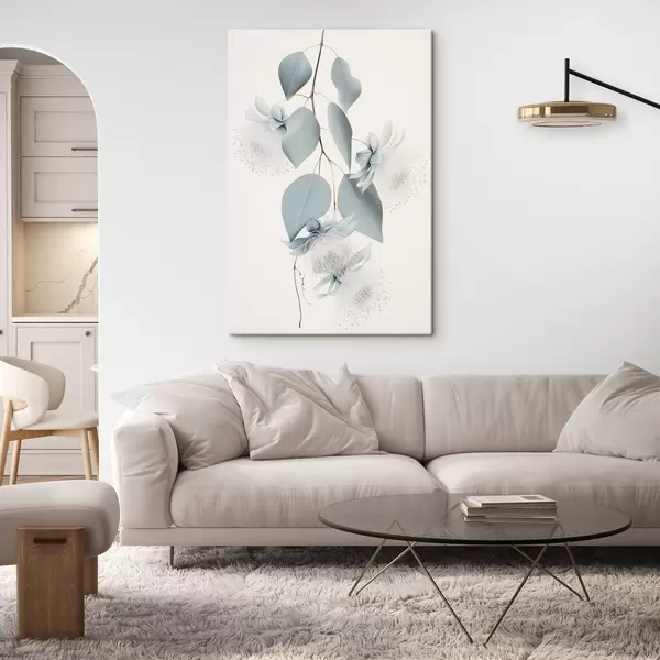 Glezna Eikalipta zariņš ar zilām lapām un baltiem ziediem, gaišs fons Nr s45947
