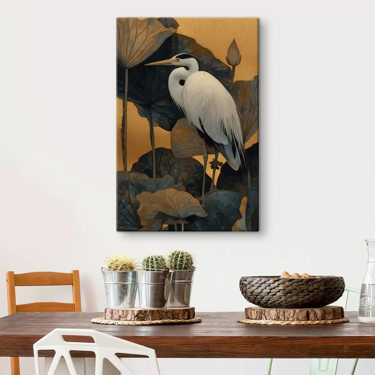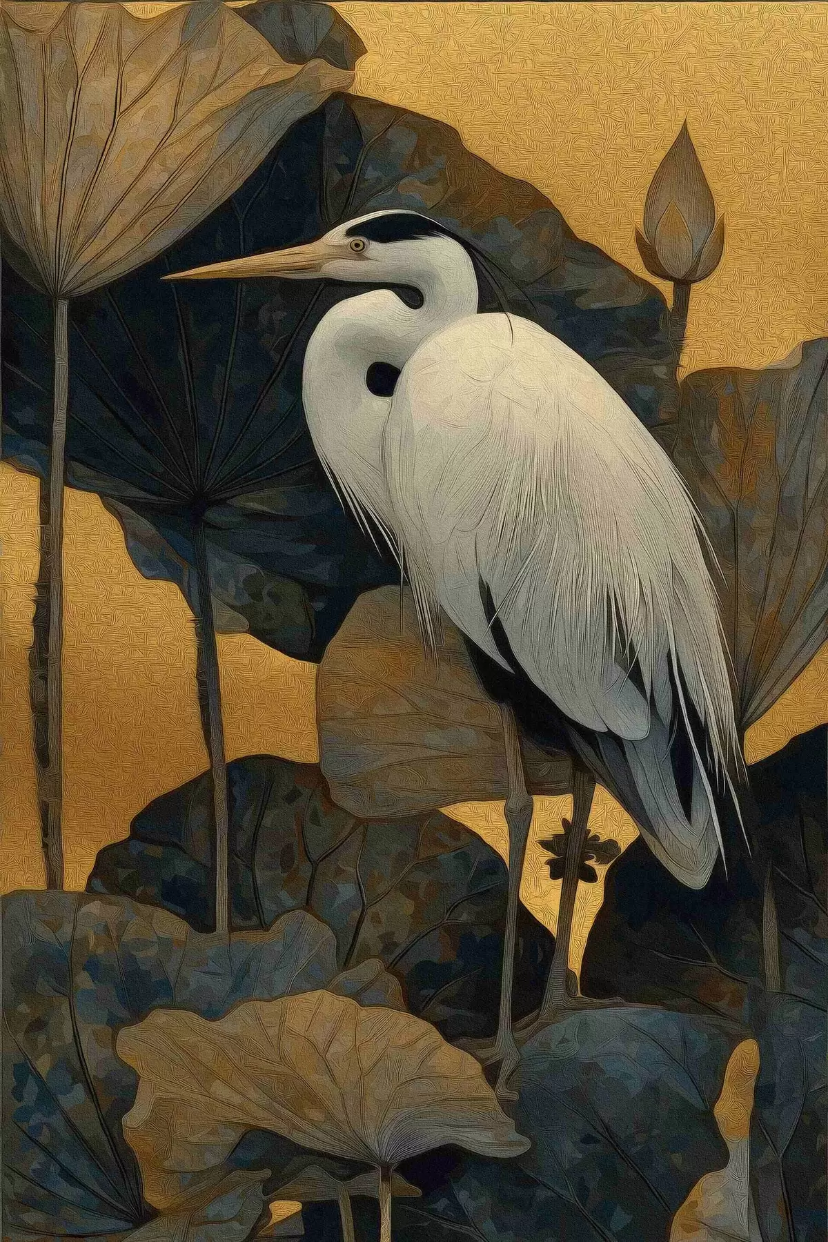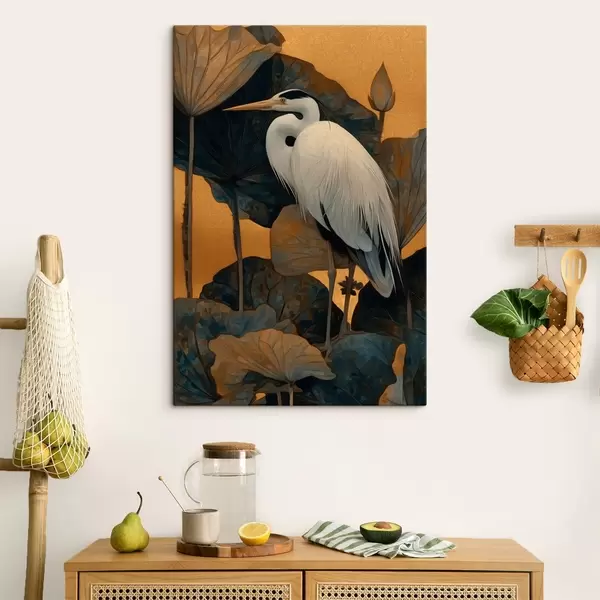 Glezna Baltā gārgale starp lielām lapām uz siltā fona Nr s46147