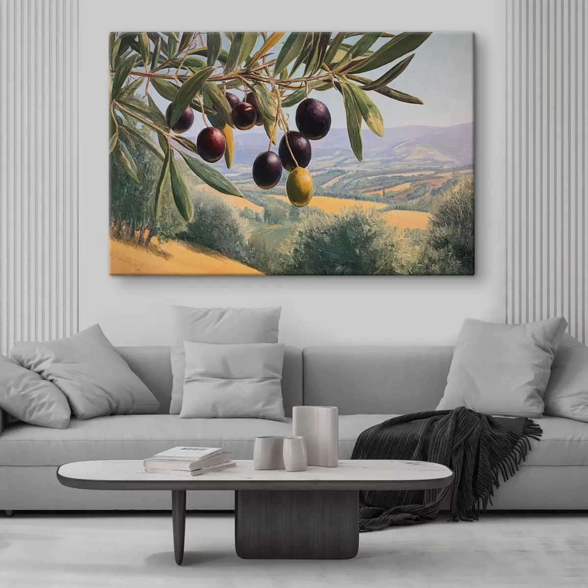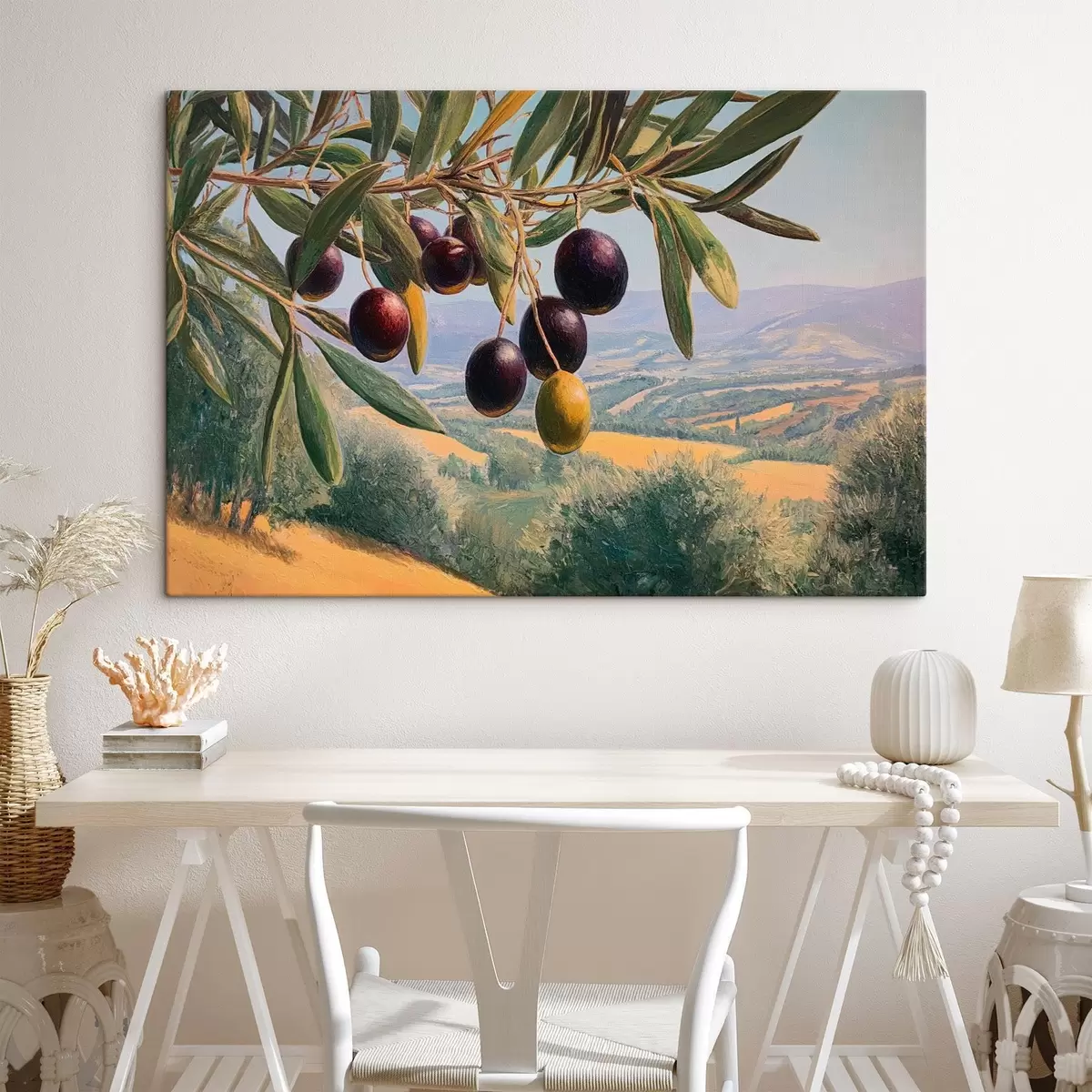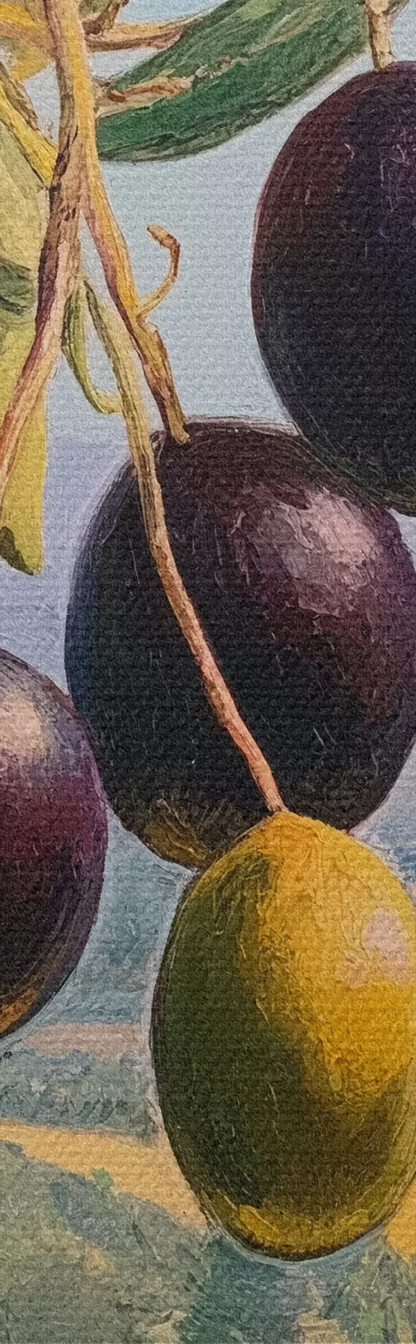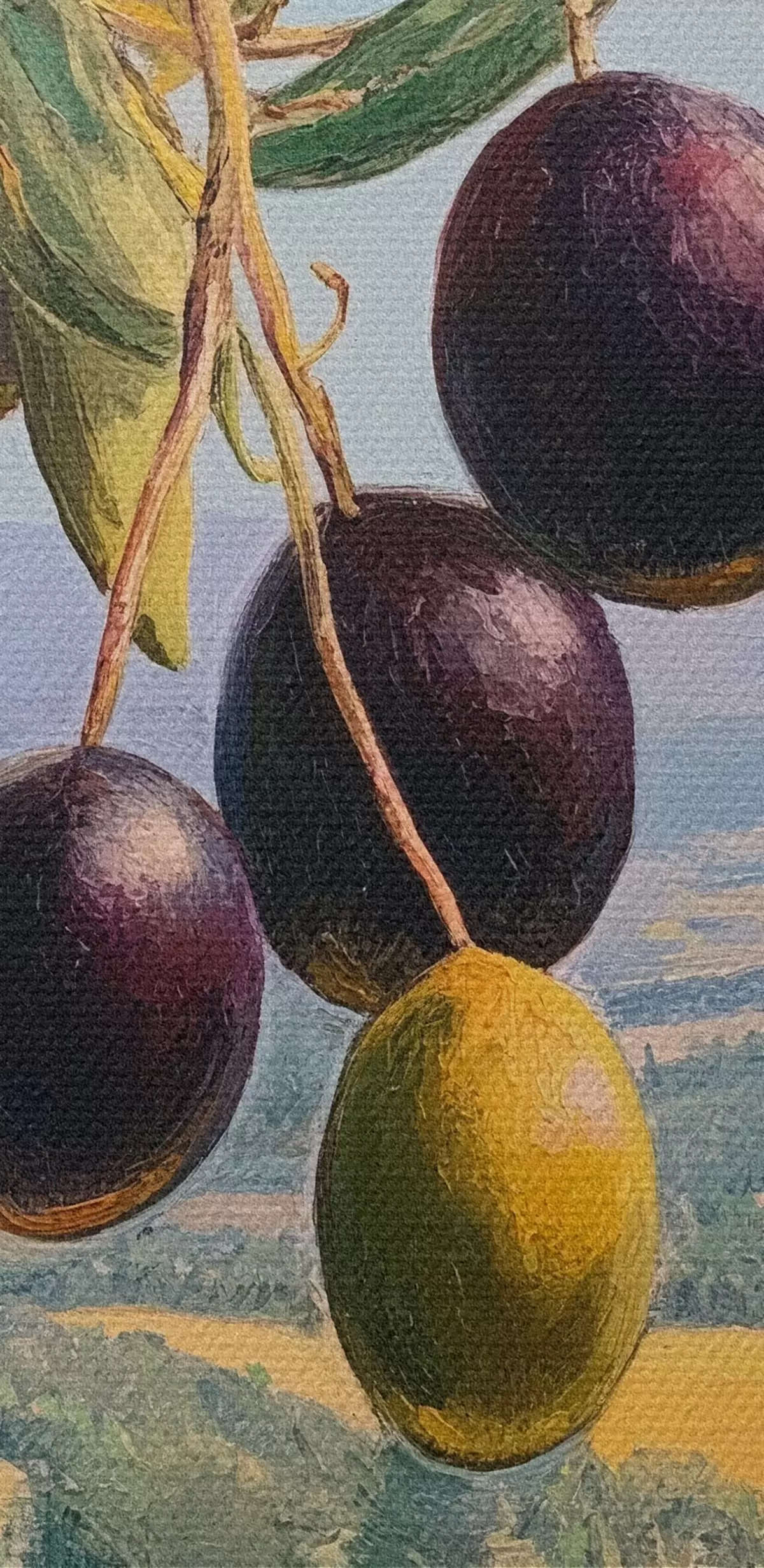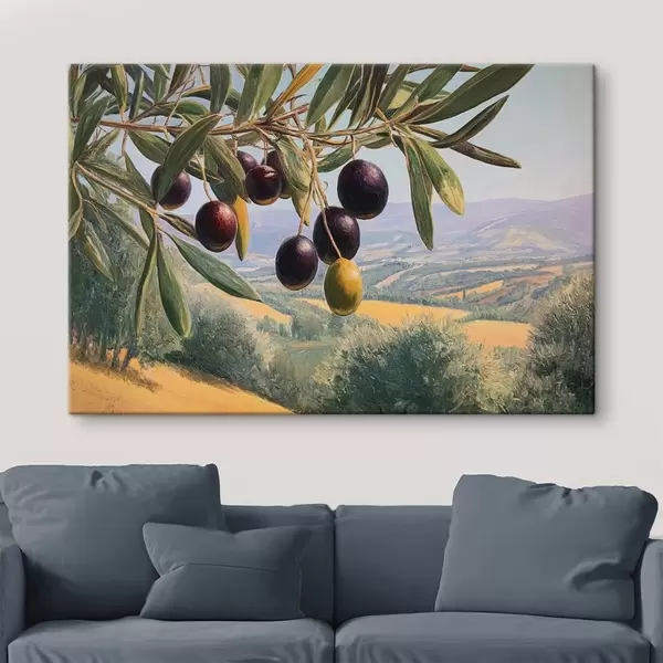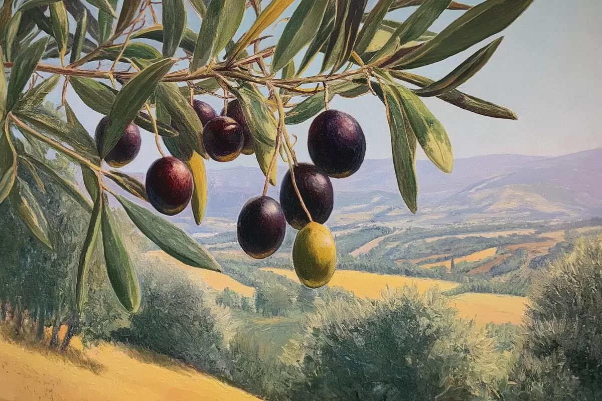 Glezna Olīvu zariņš ar tumšiem augļiem vasaras ainavas fonā Nr s46150