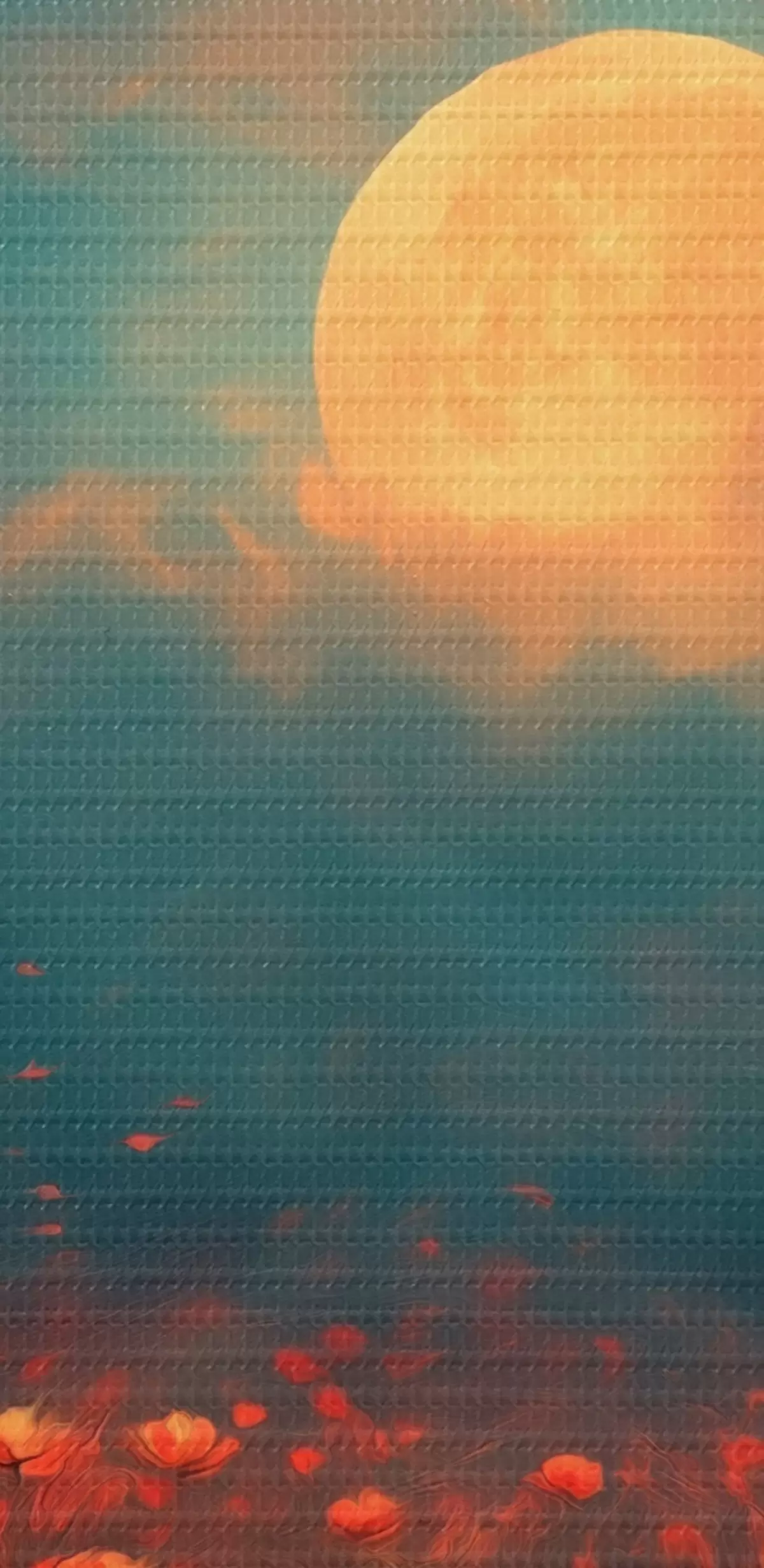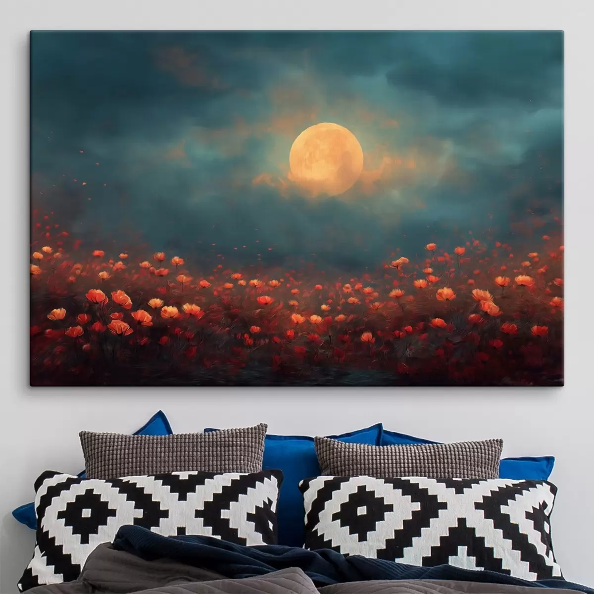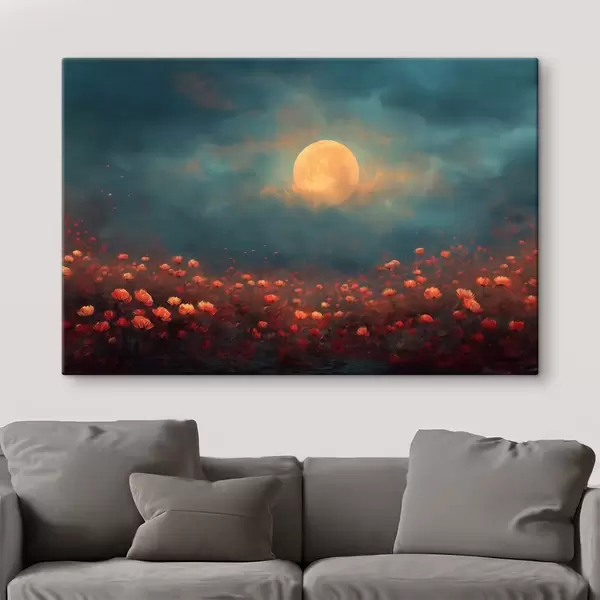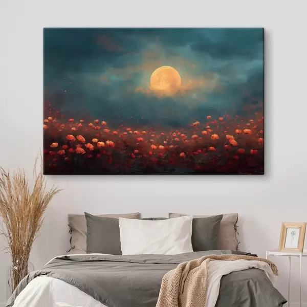 Glezna Mēness virs sarkanu ziedu lauka miglas apklātā vakara debesīs s46167