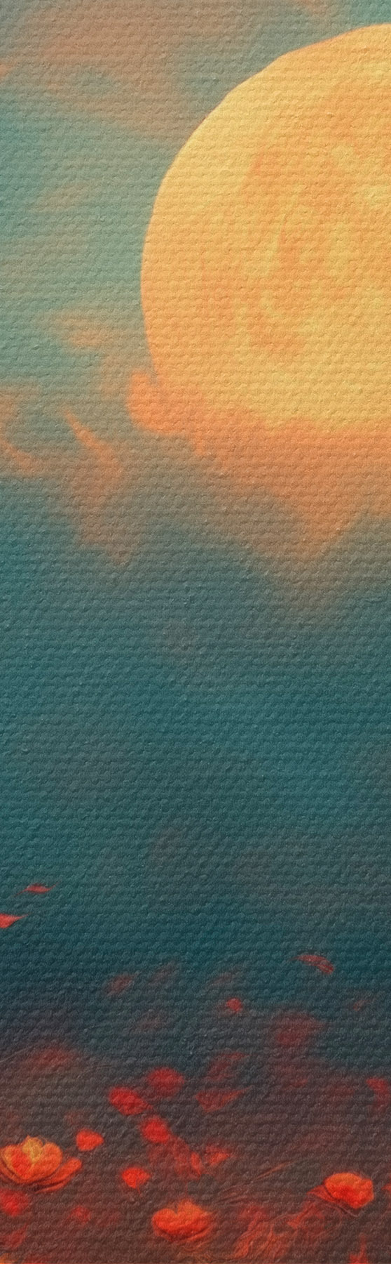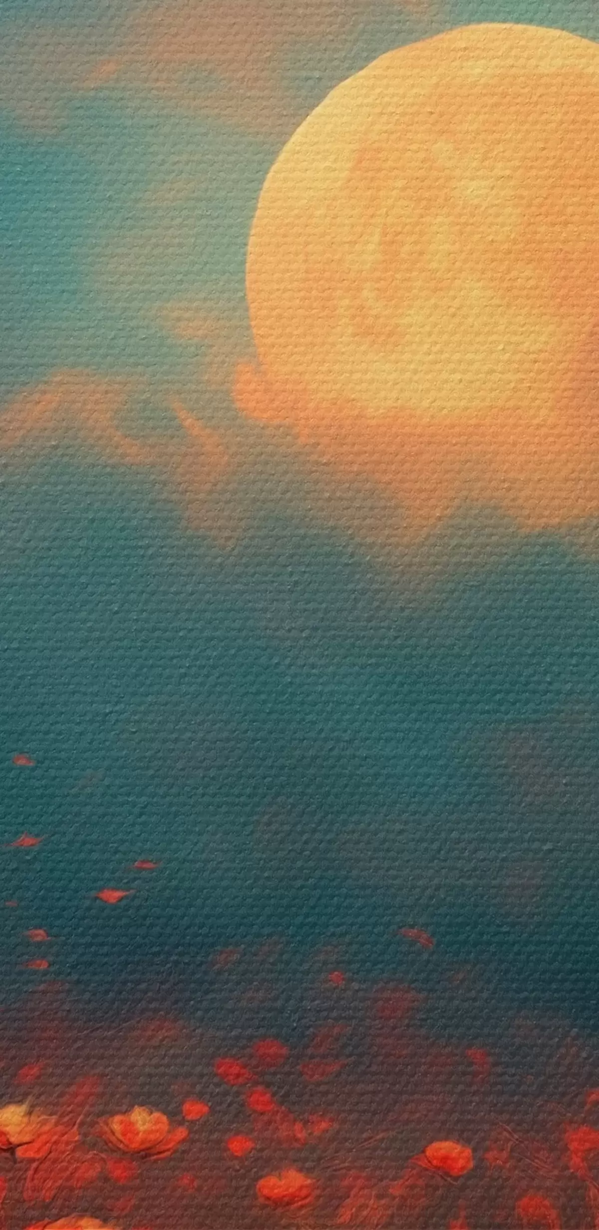 Glezna Mēness virs sarkanu ziedu lauka miglas apklātā vakara debesīs Nr s46167