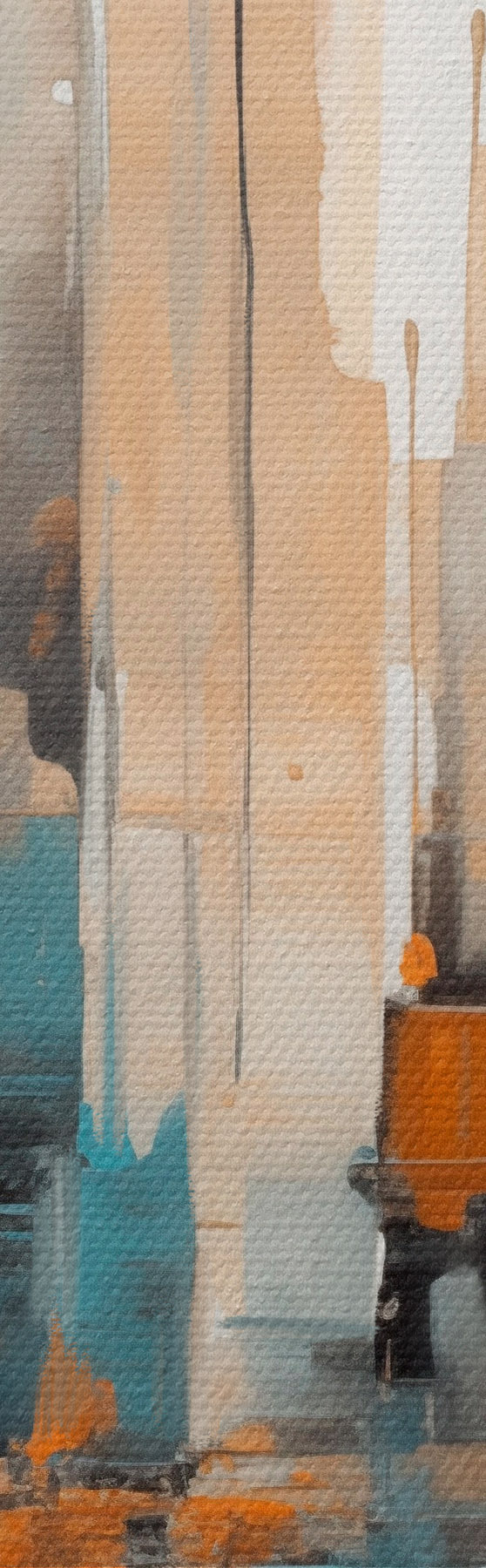 Glezna Abstrakts pilsētas skats ar oranžu, zilu un brūnu krāsu, vertikāliem otu triepieniem un ģeometriskām formām s46266
