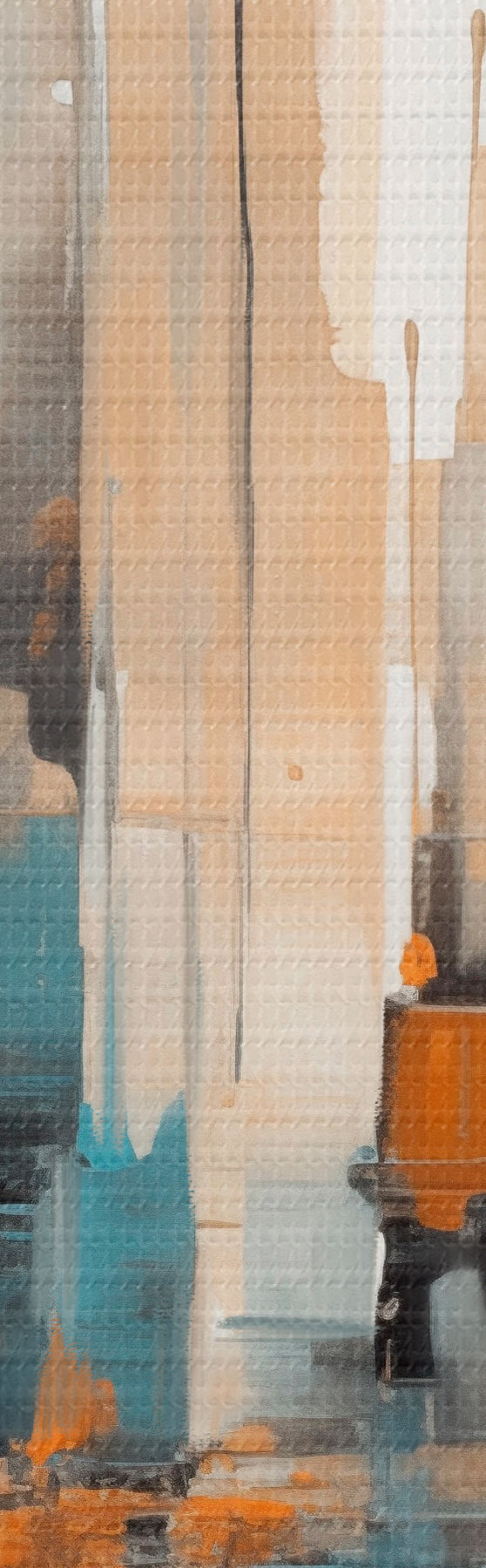 Glezna Abstrakts pilsētas skats ar oranžu, zilu un brūnu krāsu, vertikāliem otu triepieniem un ģeometriskām formām Nr s46266
