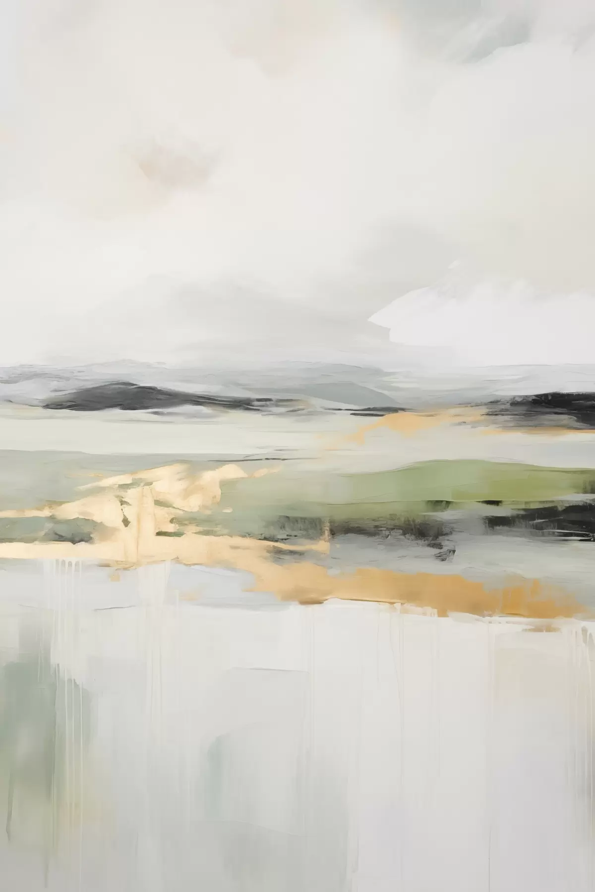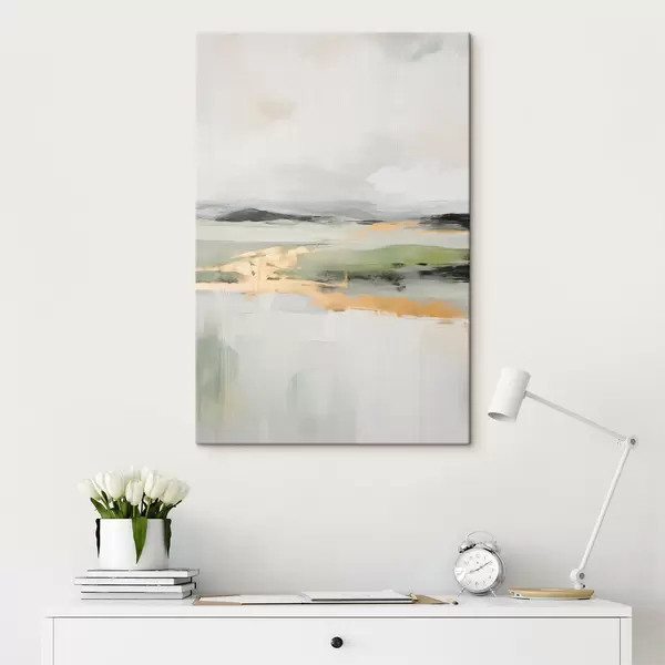 Glezna Abstrakts ainavas attēls ar dzelteniem akcentiem, minimālistiska zemes, ūdens un debesu kompozīcija ar klusinātiem toņiem s46269