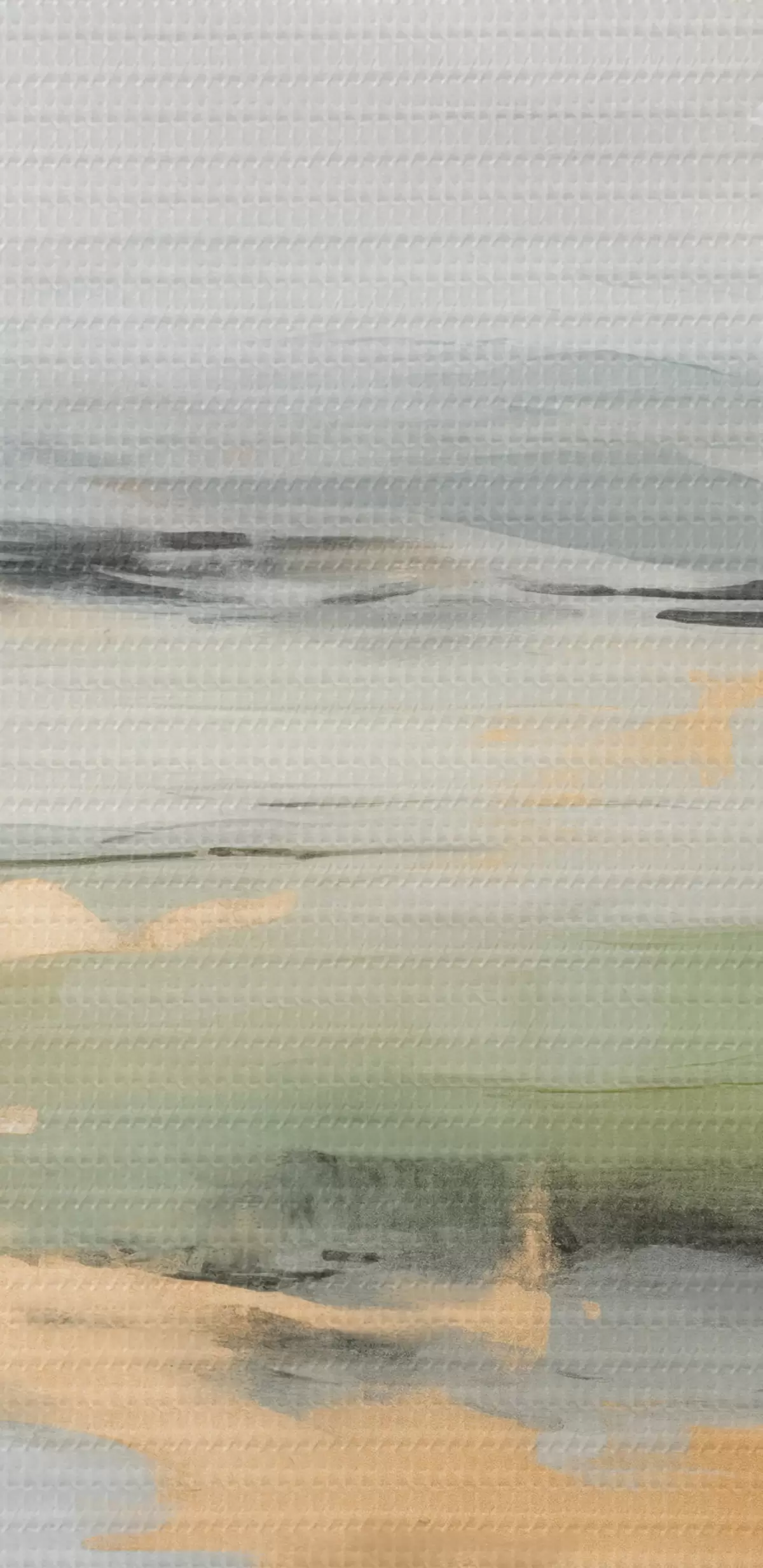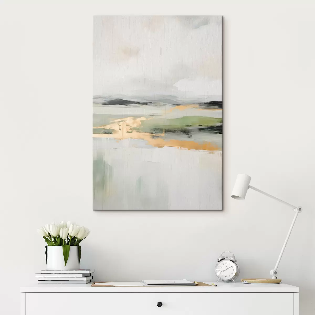 Glezna Abstrakts ainavas attēls ar dzelteniem akcentiem, minimālistiska zemes, ūdens un debesu kompozīcija ar klusinātiem toņiem Nr s46269