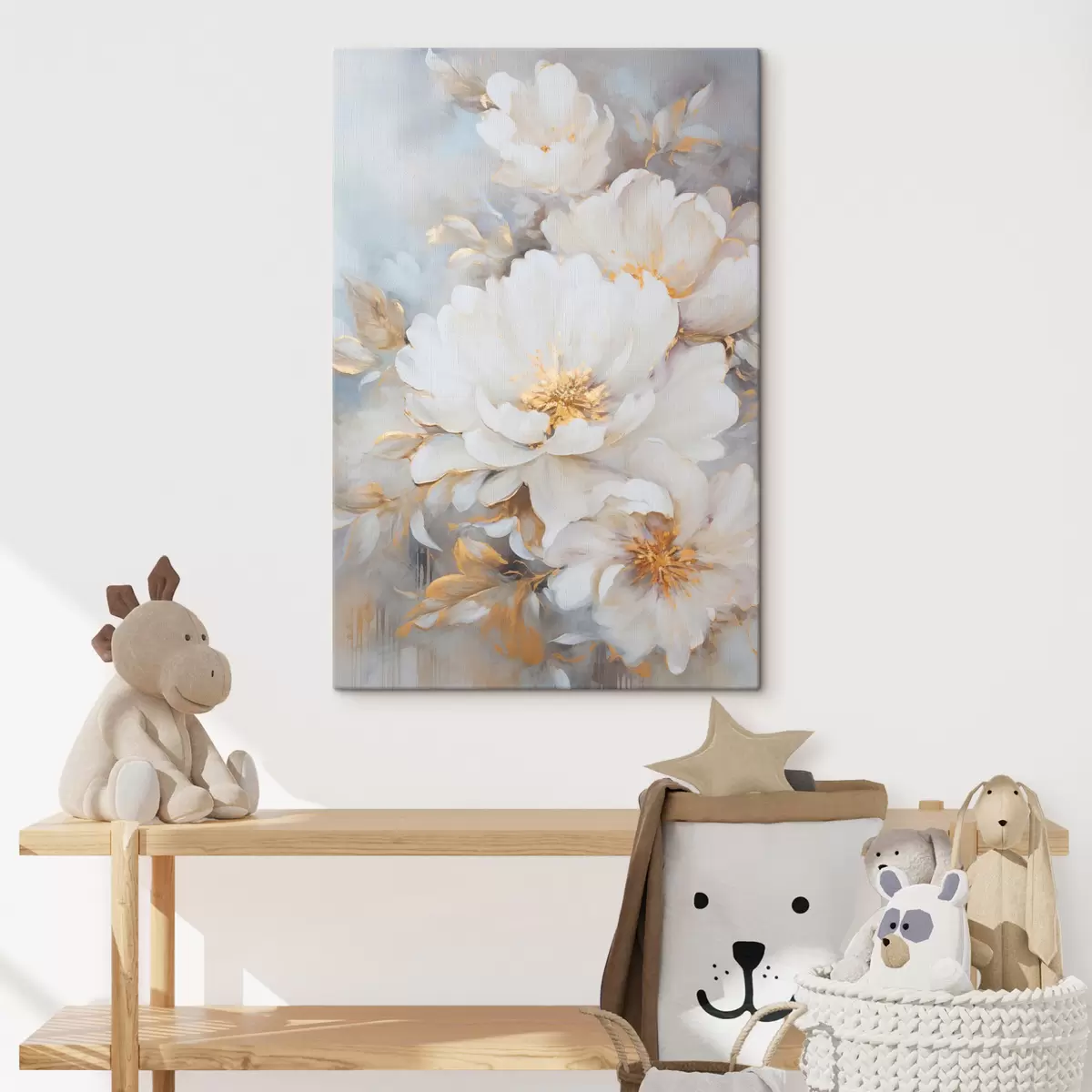 Glezna Baltas peonijas ar dzeltenu centru un lapām, maigi otas triepieni, gaiši zils fons, ziedu kompozīcija s46271