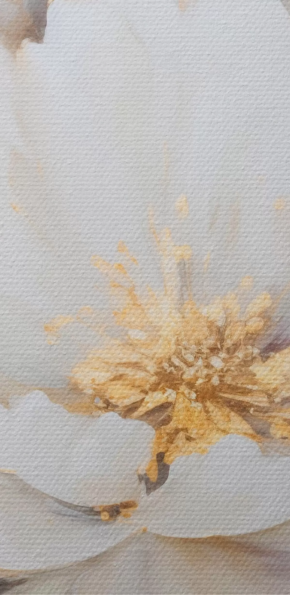 Glezna Baltas peonijas ar dzeltenu centru un lapām, maigi otas triepieni, gaiši zils fons, ziedu kompozīcija Nr s46271