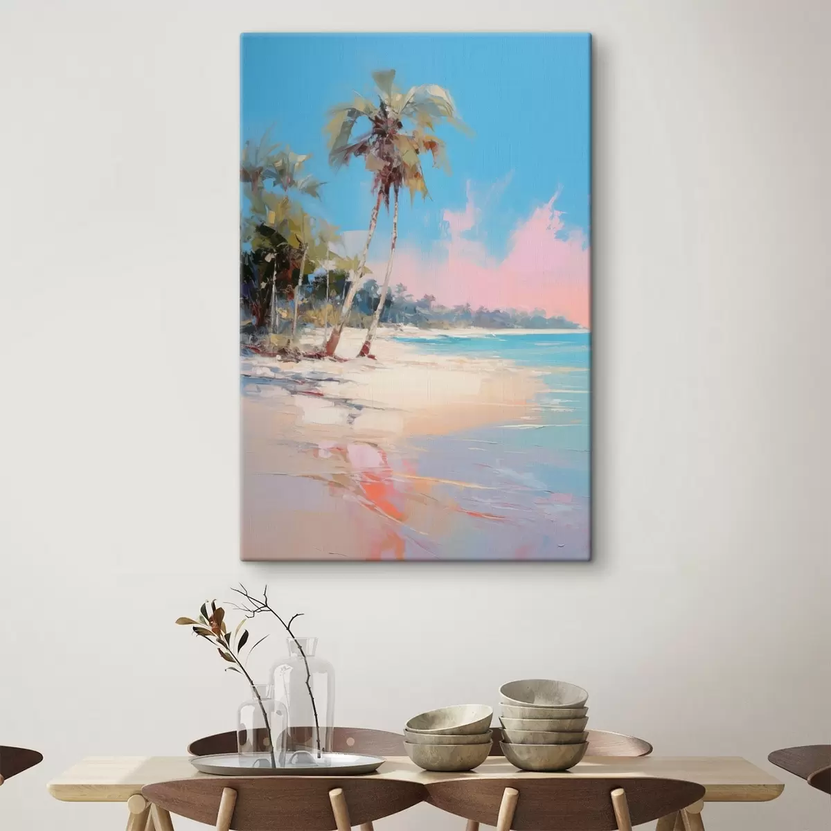 Glezna Abstrakta tropu pludmale ar balto smilti un palmu kokiem, zils debesis ar baltiem mākoņiem s46285