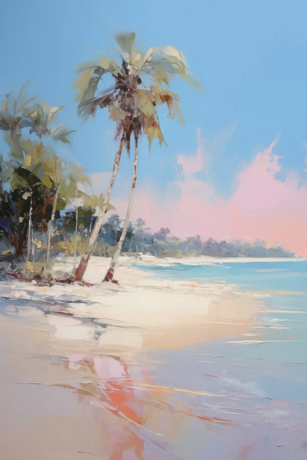Glezna Abstrakta tropu pludmale ar balto smilti un palmu kokiem, zils debesis ar baltiem mākoņiem Nr s46285