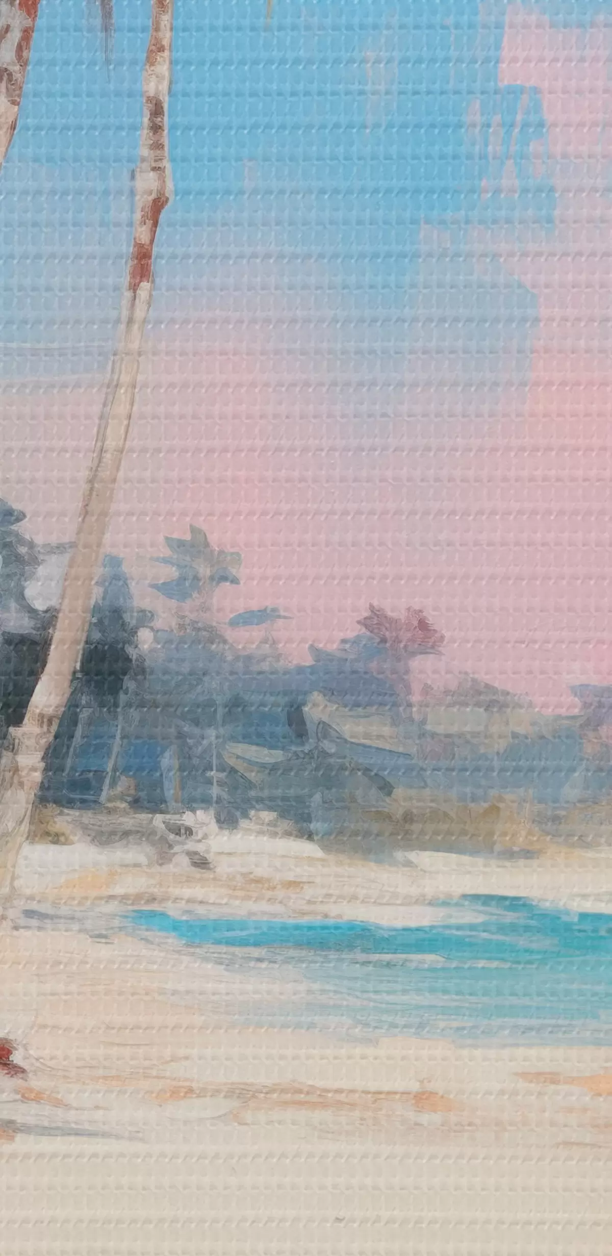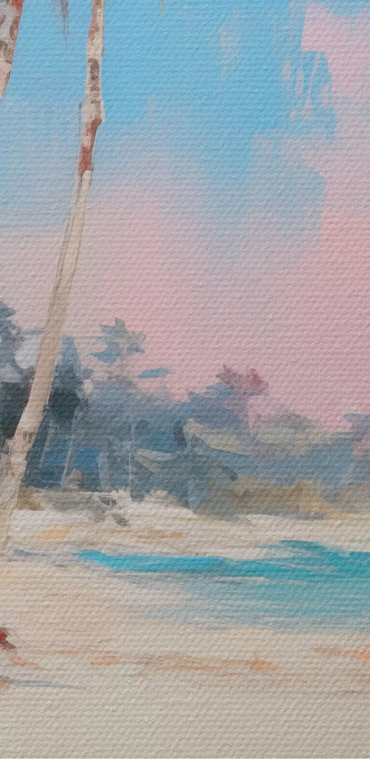 Glezna Abstrakta tropu pludmale ar balto smilti un palmu kokiem, zils debesis ar baltiem mākoņiem s46285