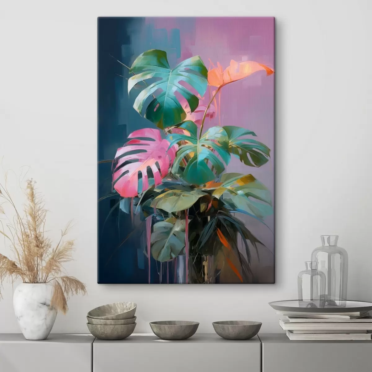 Glezna Abstrakta monstera augs ar rozā un zaļām lapām, spilgtām krāsām, uz izplūduša fona Nr s46287