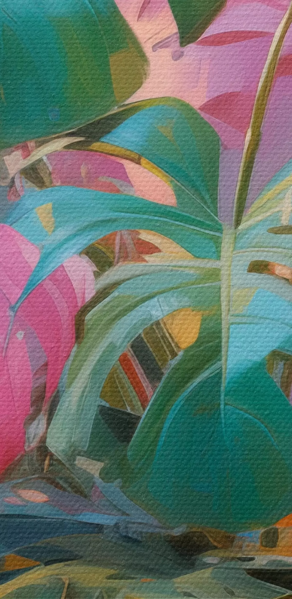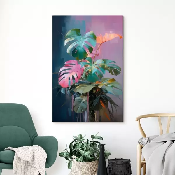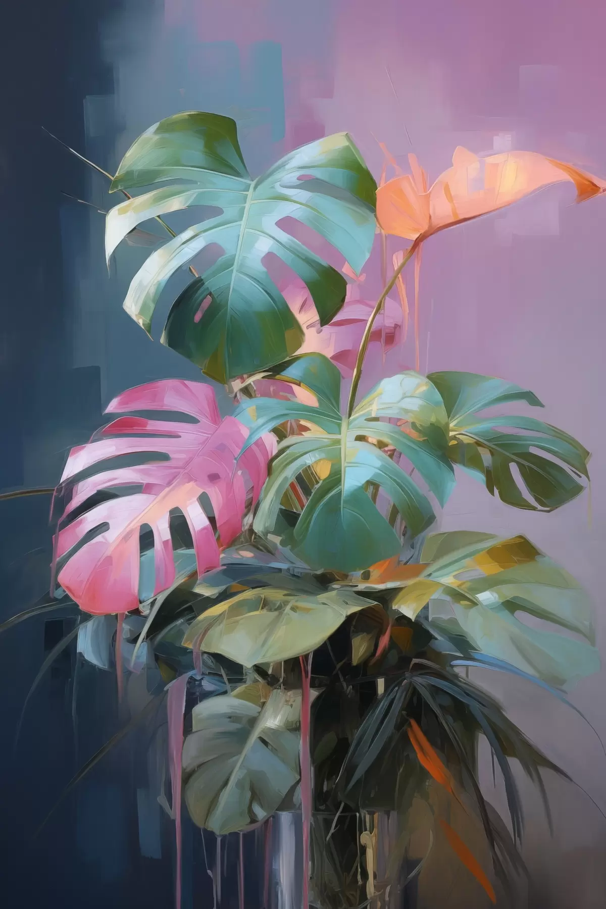 Glezna Abstrakta monstera augs ar rozā un zaļām lapām, spilgtām krāsām, uz izplūduša fona Nr s46287