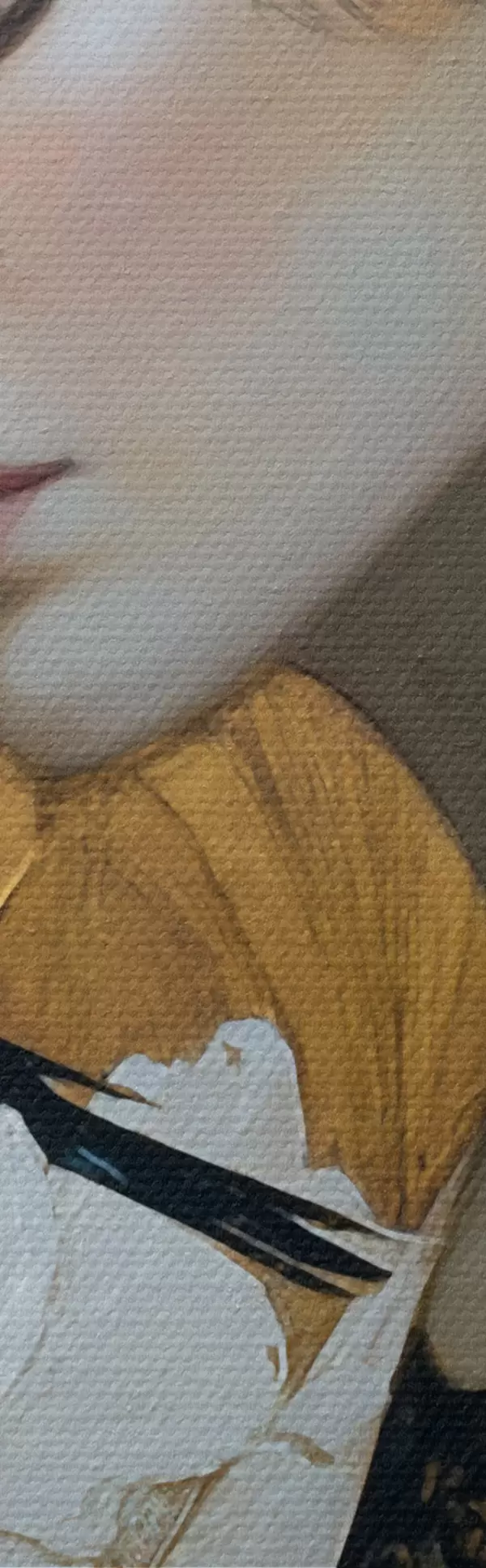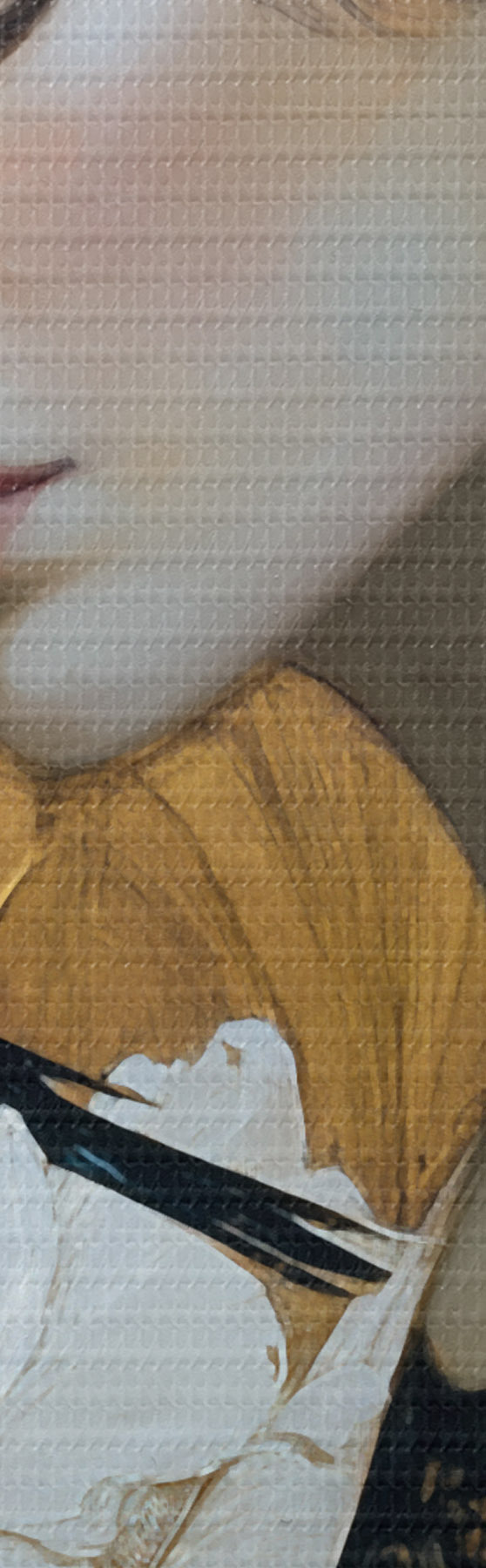 Smalkais diegu pinums uz šī audekla atgādina profesionālu mākslinieku audeklu virsmu.