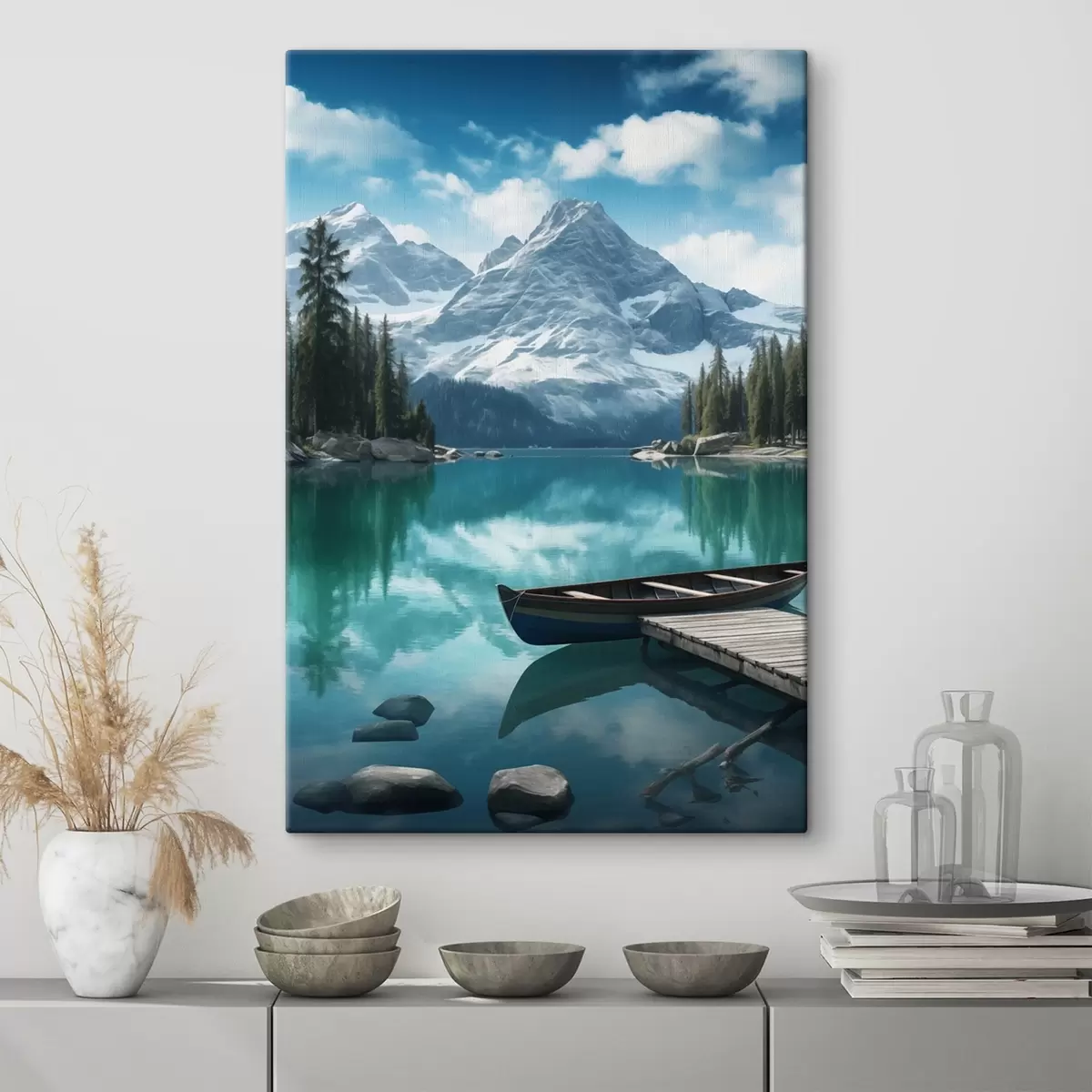 Glezna Alpu ezers ar kanoe un sniegotiem virsotnēm Nr s46481