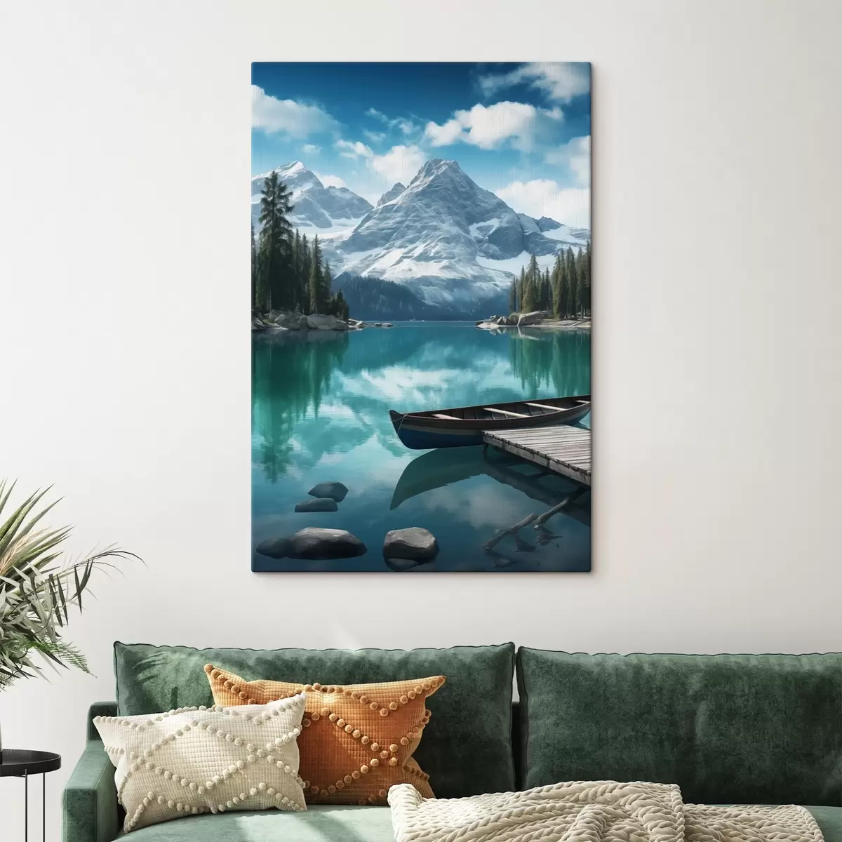 Glezna Alpu ezers ar kanoe un sniegotiem virsotnēm s46481