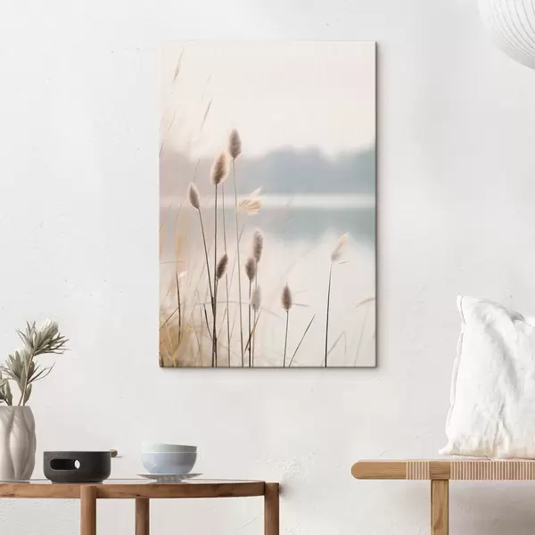 Glezna Mīkstas niedres pie miglas apklāta ezera krasta, pasteļtoņos smilškrāsas toņos s46504