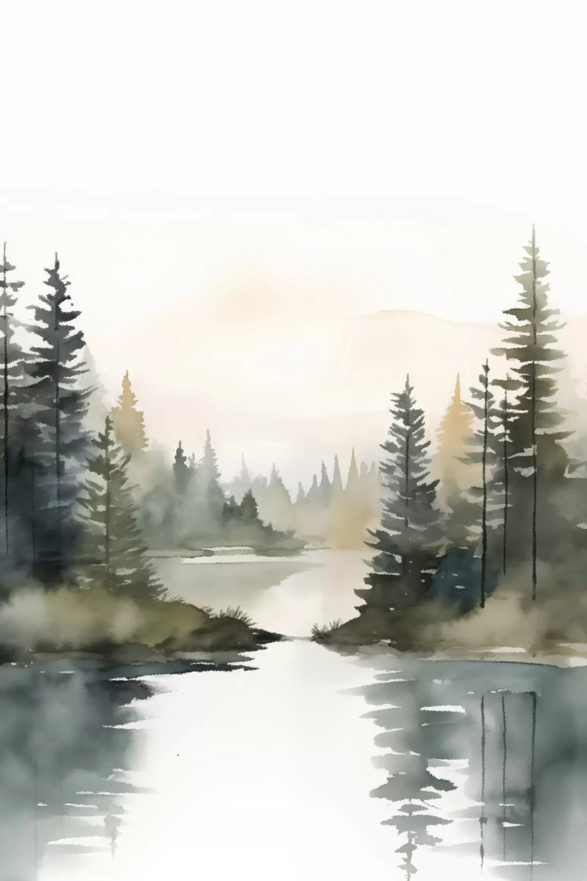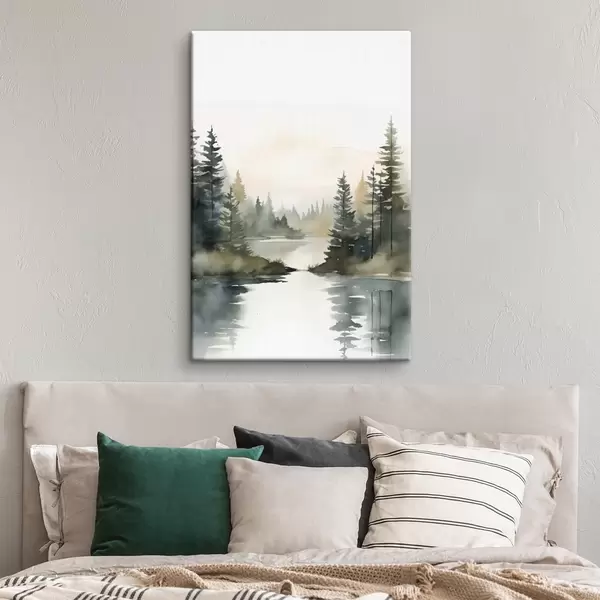 Glezna Miglas apklāts skujkoku mežs virs rāma upes, akvareļa stilā Nr s46507