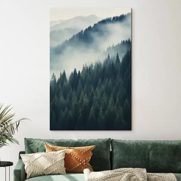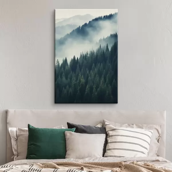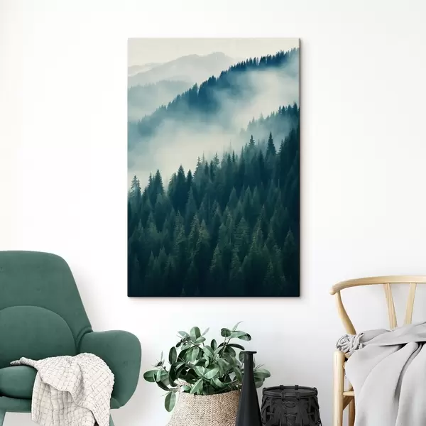 Glezna Migla virs skujkoku nogāzēm, dziļi zaļie toņi Nr s46516
