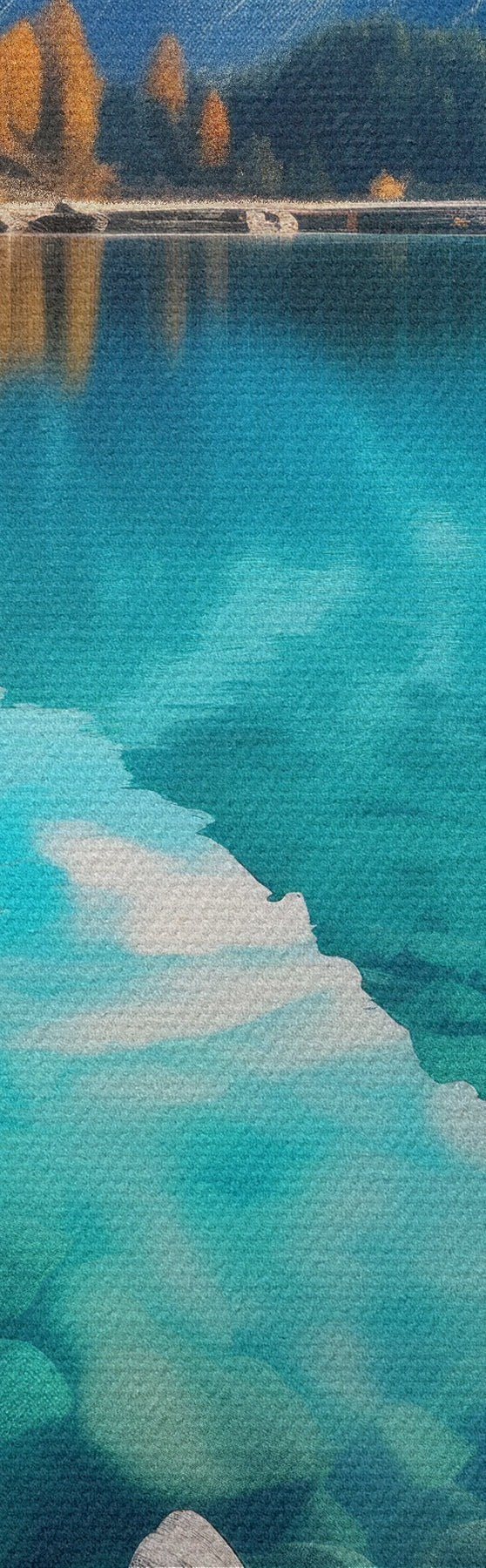 Glezna Kalnu ezers ar tirkīza krāsas ūdeni un rudens lapeglēm Nr s46517