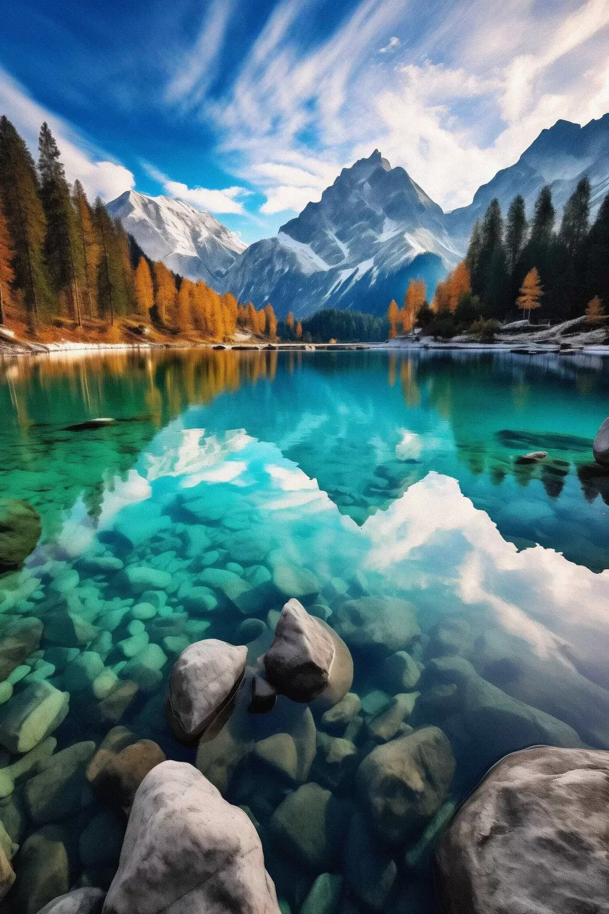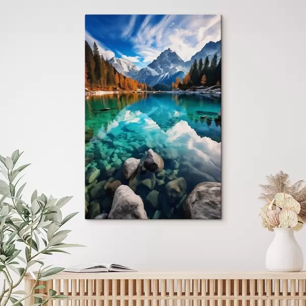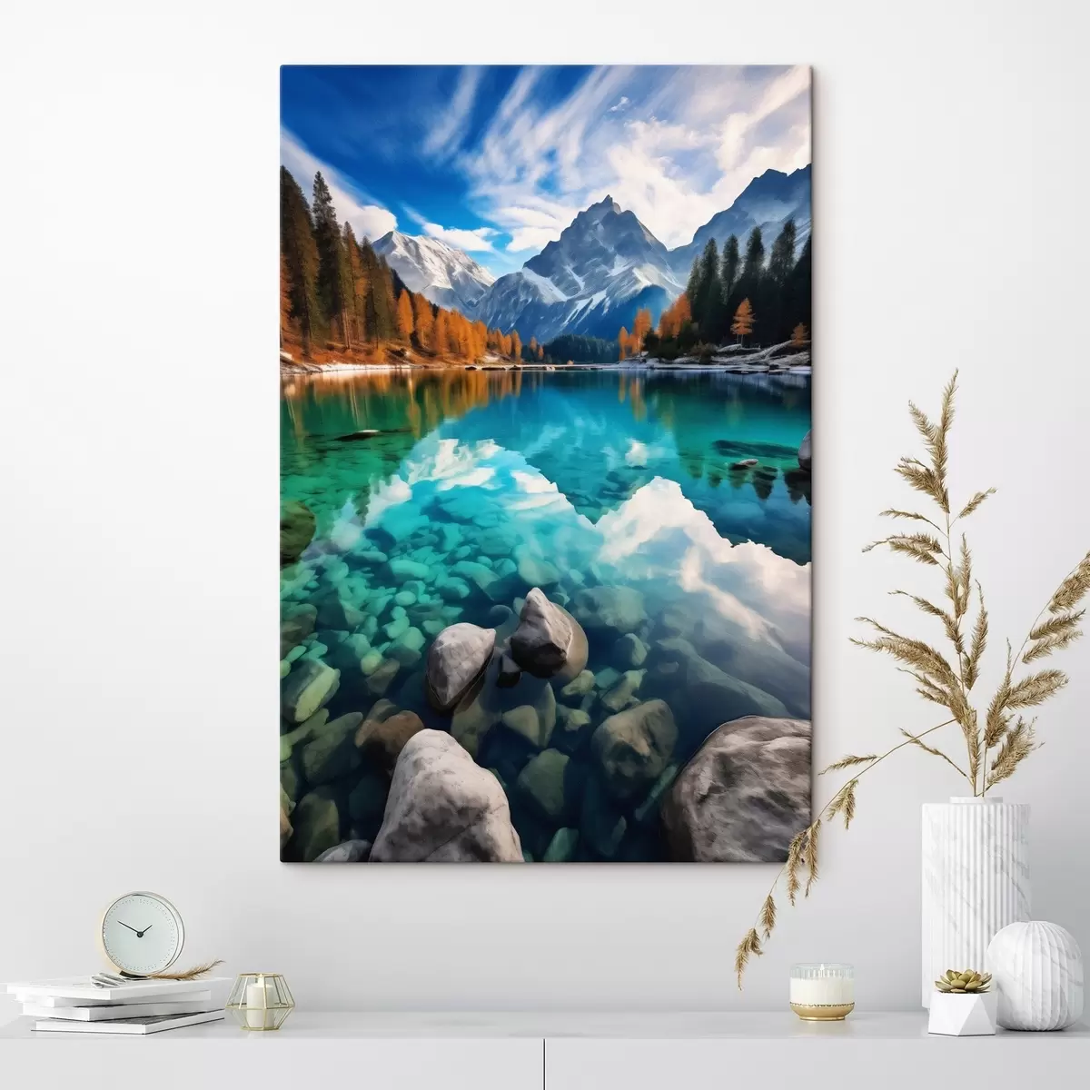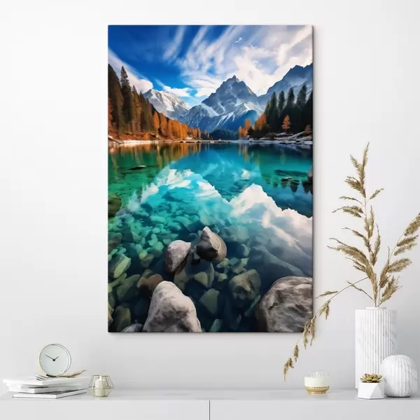 Glezna Kalnu ezers ar tirkīza krāsas ūdeni un rudens lapeglēm Nr s46517