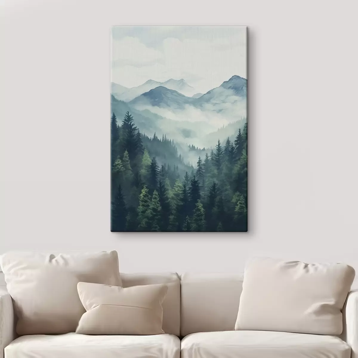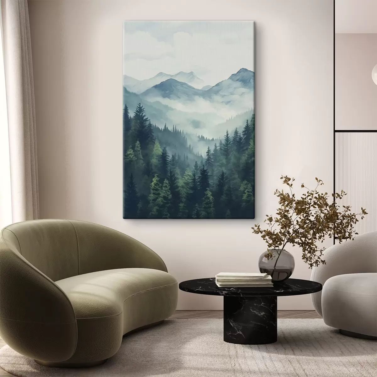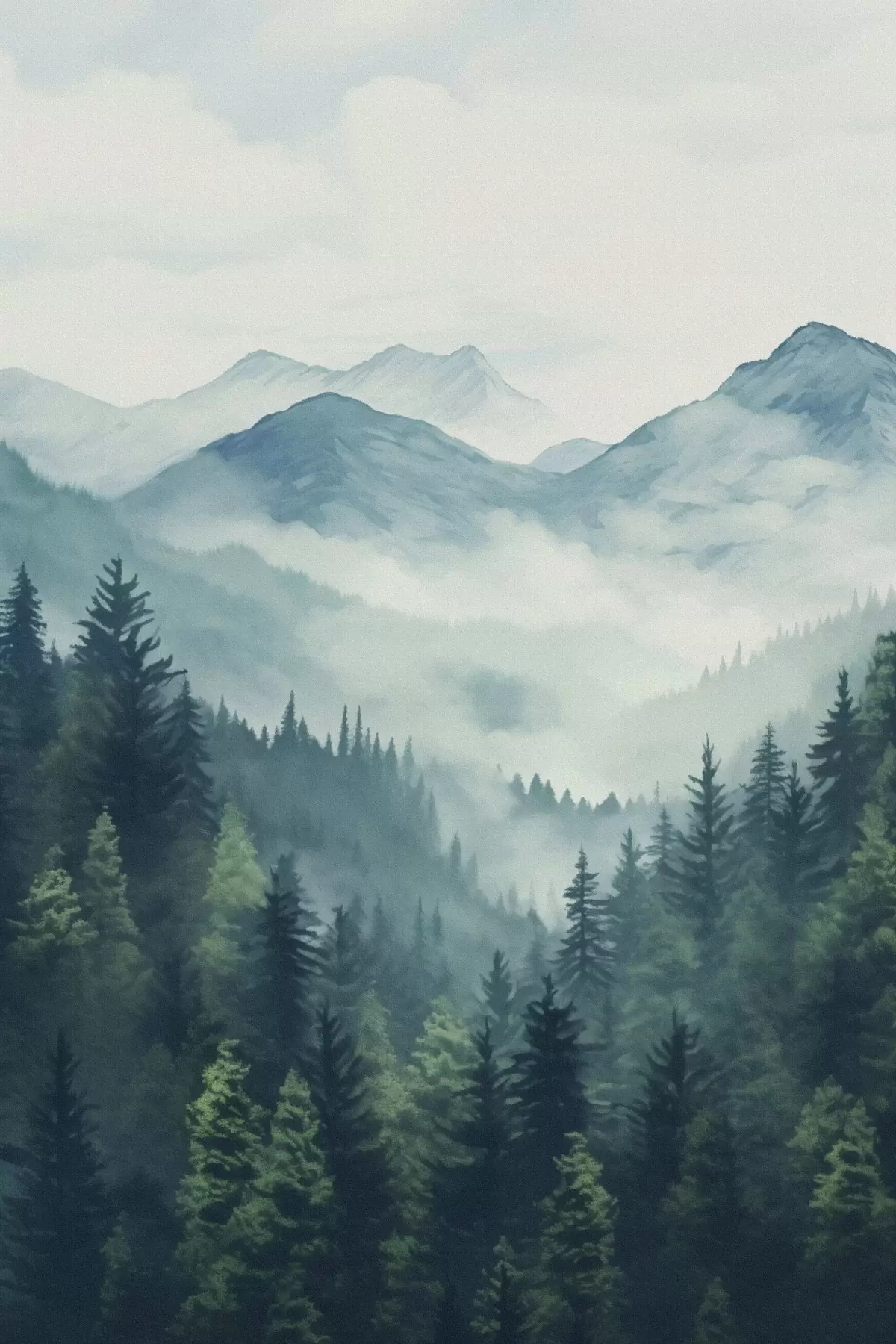 Glezna Akvareļu kalni un mežs maigā rīta miglā Nr s46519