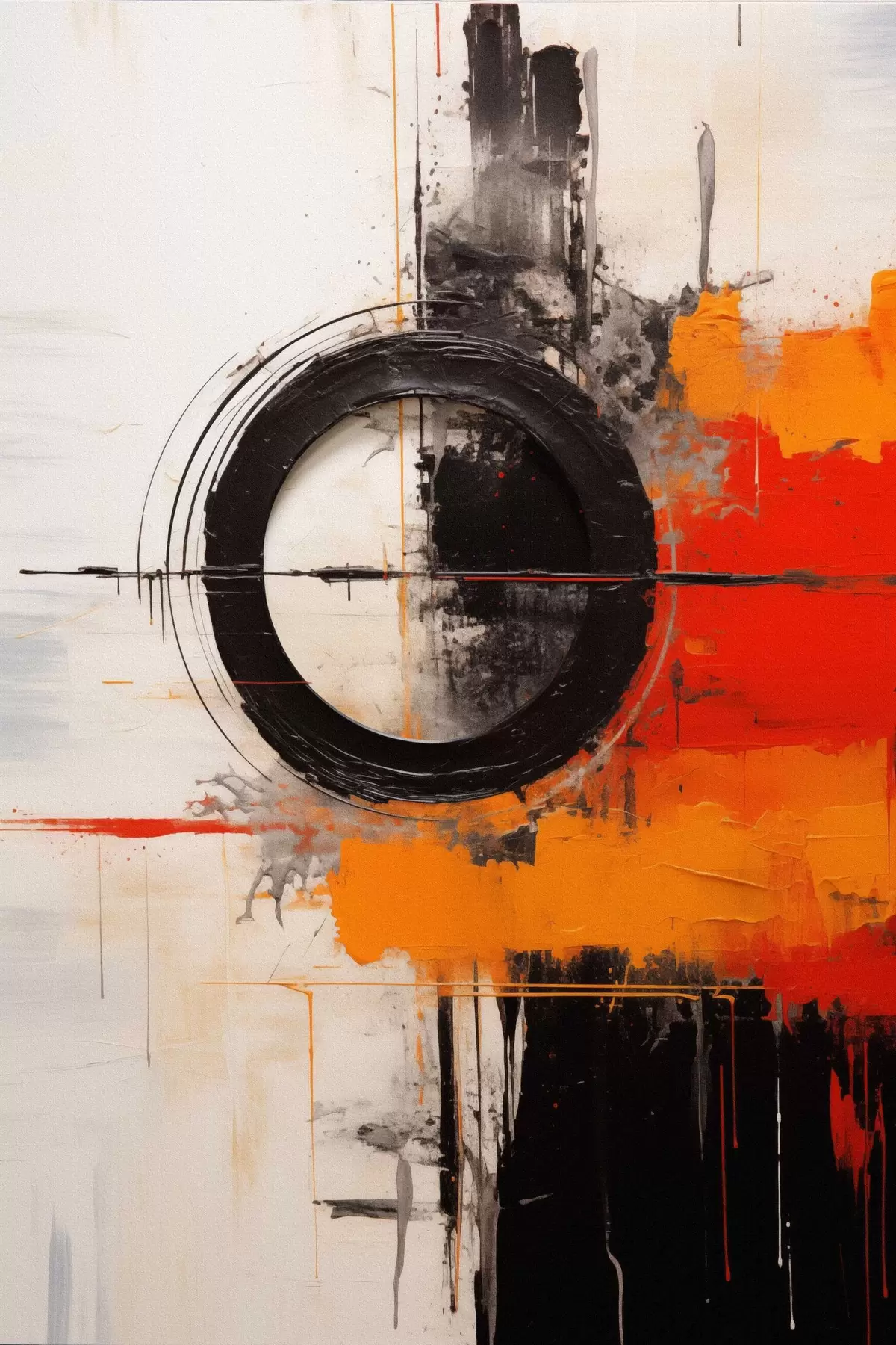Glezna Melna apļa uz balta fona, oranžas līnijas un šļakatas Nr s46549
