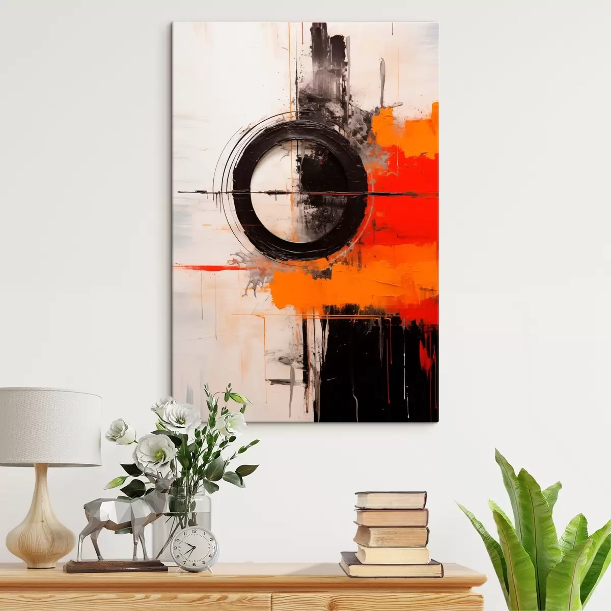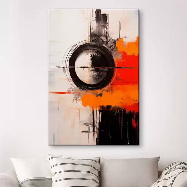 Glezna Melna apļa uz balta fona, oranžas līnijas un šļakatas s46549