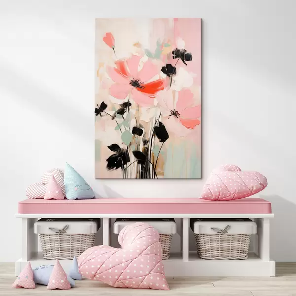 Glezna Rozā un melni ziedi ar lapām, maigas pasteļtoņos, abstrakts ziedu kompozīcija, minimālisma māksla Nr s46687