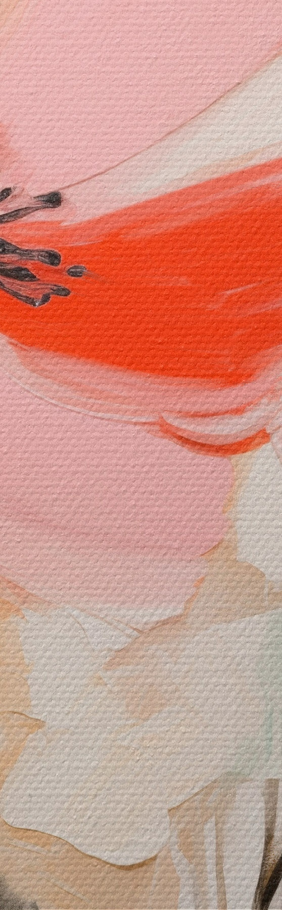 Glezna Rozā un melni ziedi ar lapām, maigas pasteļtoņos, abstrakts ziedu kompozīcija, minimālisma māksla s46687