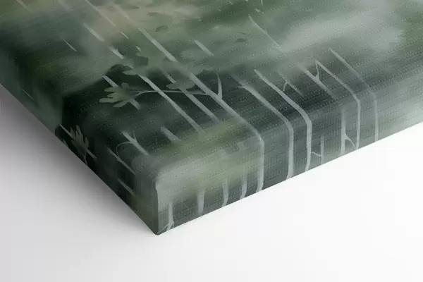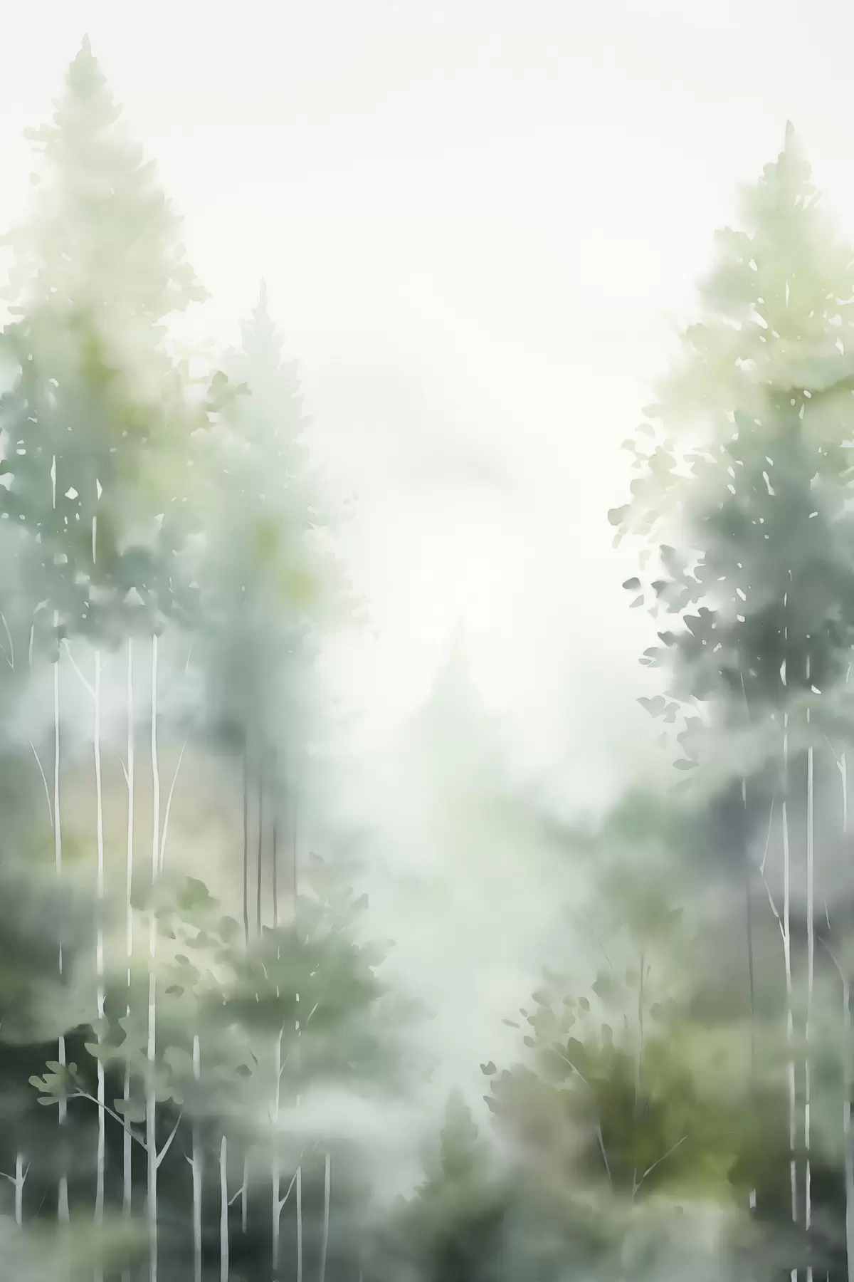 Glezna Akvareļa glezna, kas imitē abstraktu mežu ar augstiem kokiem un zaļām lapām, maigās, klusās krāsās s46689