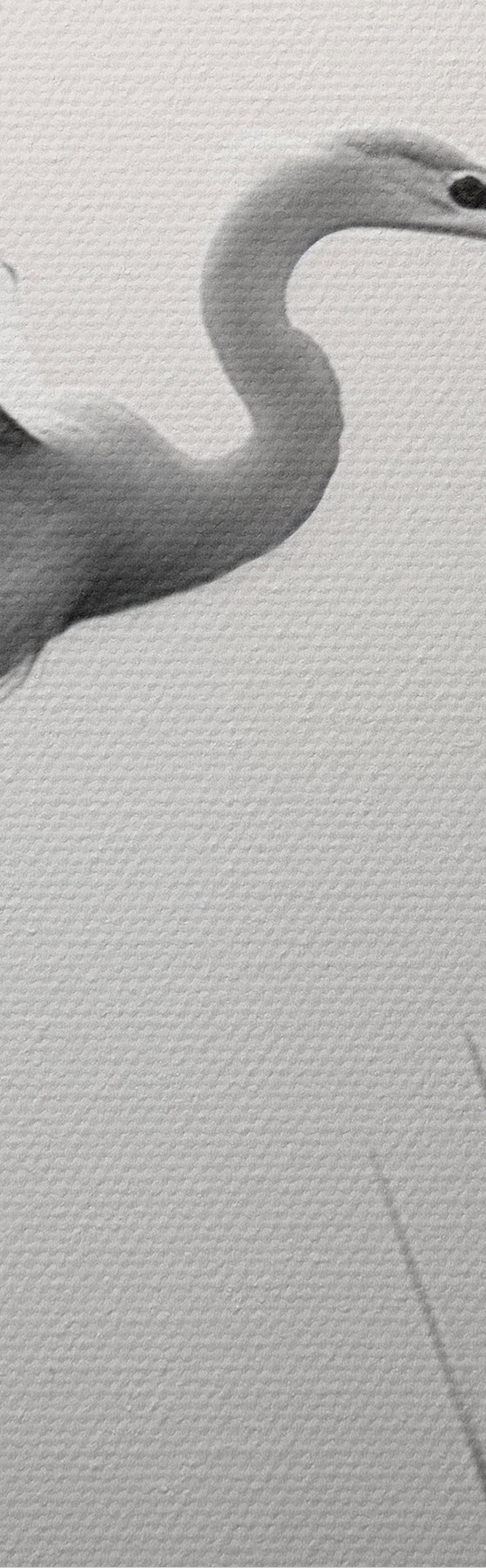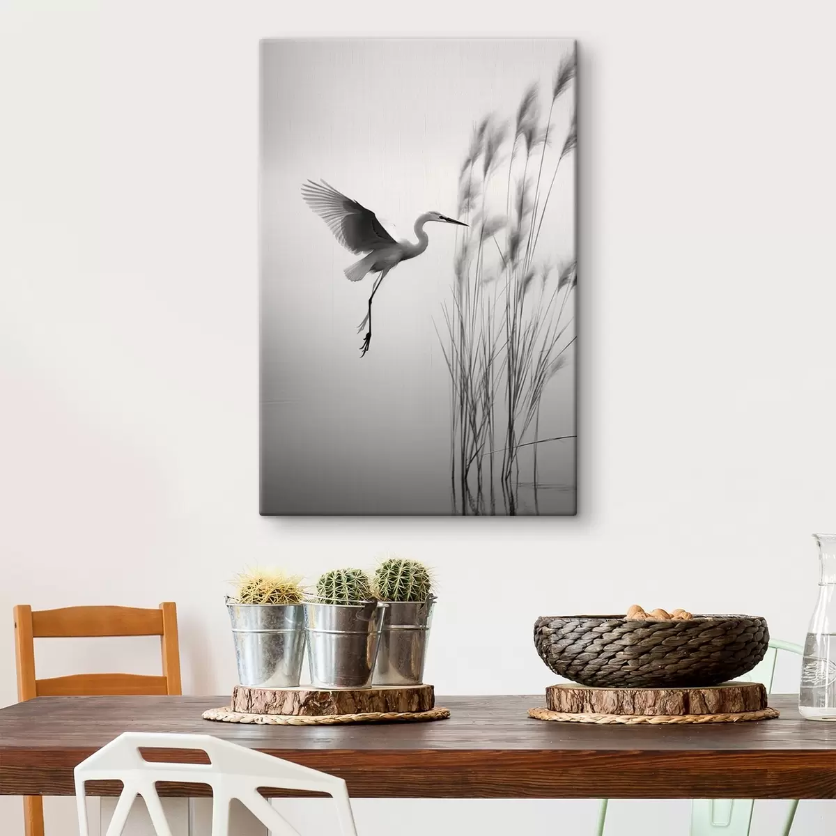 Glezna Baltā gārgale ar izplestiem spārniem, lidojot pie augstiem niedriem, melnbalta minimālisma kompozīcija Nr s46693