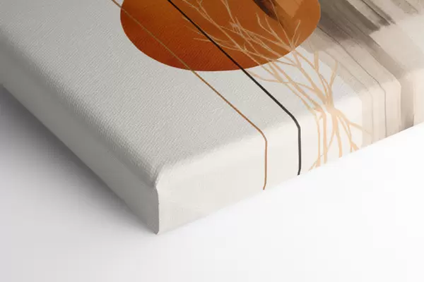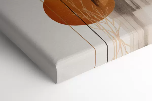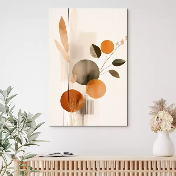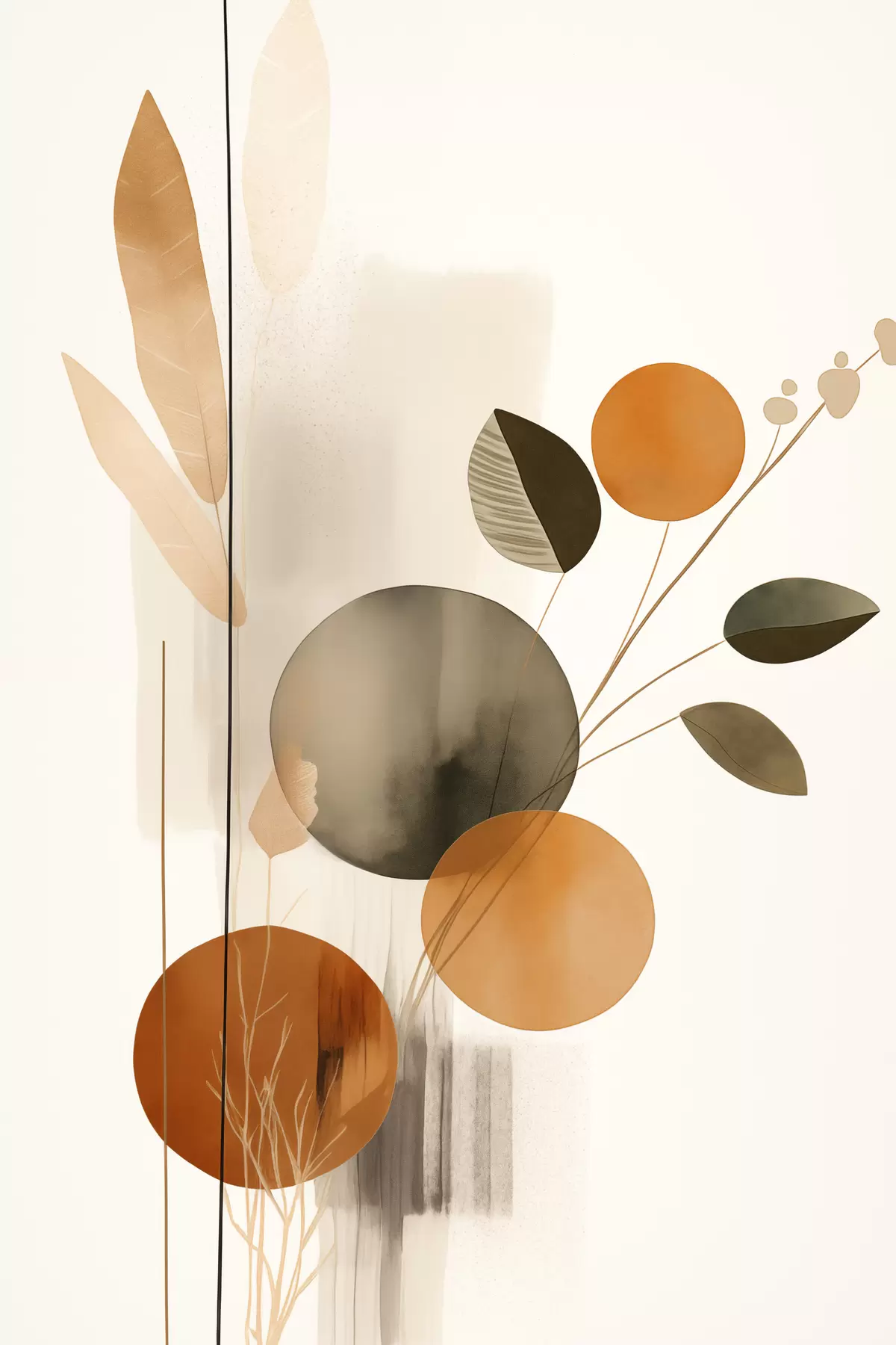 Glezna Abstrakta glezna ar oranžiem un pelēkiem apļiem, lapām un zariem, modernā stilā, akvareļa efekts Nr s46697