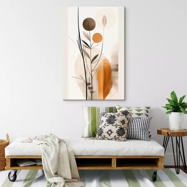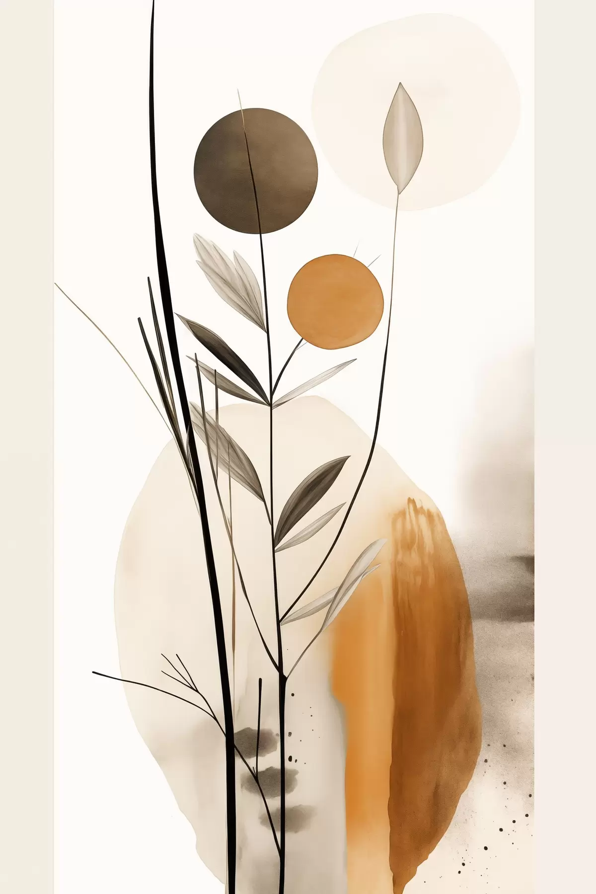 Glezna Abstrakta glezna ar oranžiem un pelēkiem apļiem, lapām un zariem, modernā stilā, akvareļa efekts Nr s46698
