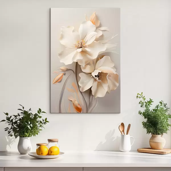 Glezna Baltas puķes, ziedlapiņas ar maigām ēnām, gaiši smilškrāsas fons, eleganta kompozīcija, minimālisma stils Nr s46700