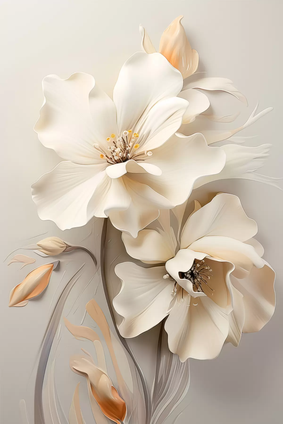 Glezna Baltas puķes, ziedlapiņas ar maigām ēnām, gaiši smilškrāsas fons, eleganta kompozīcija, minimālisma stils Nr s46700