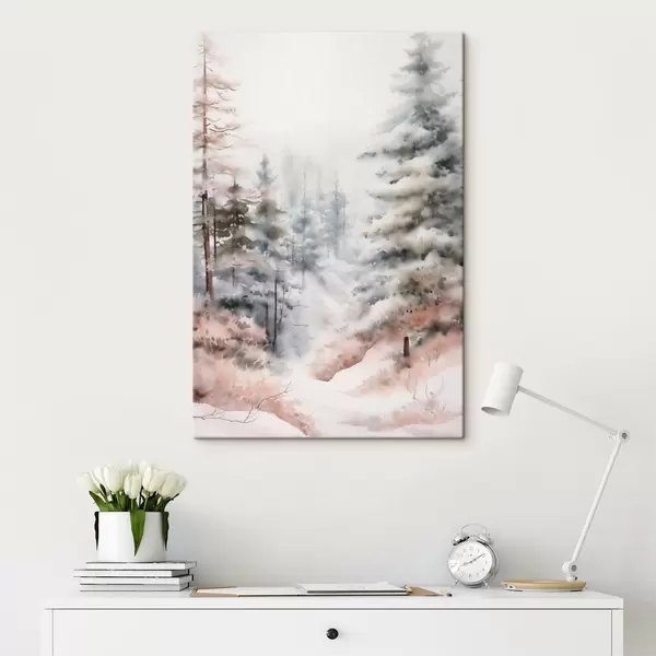 Glezna Augstas, sniega klātas priedes, kas stāv miglas apņemtā mežā, maiga, klusa ziemas ainava Nr s46702