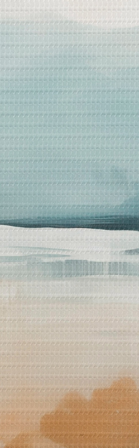 Glezna Abstrakts ainavas ar kalniem un ezeru zilgani zaļā un teksturētā dzeltenā krāsā, maigi otas triepieni, minimālisma mākslas darbs Nr s46703